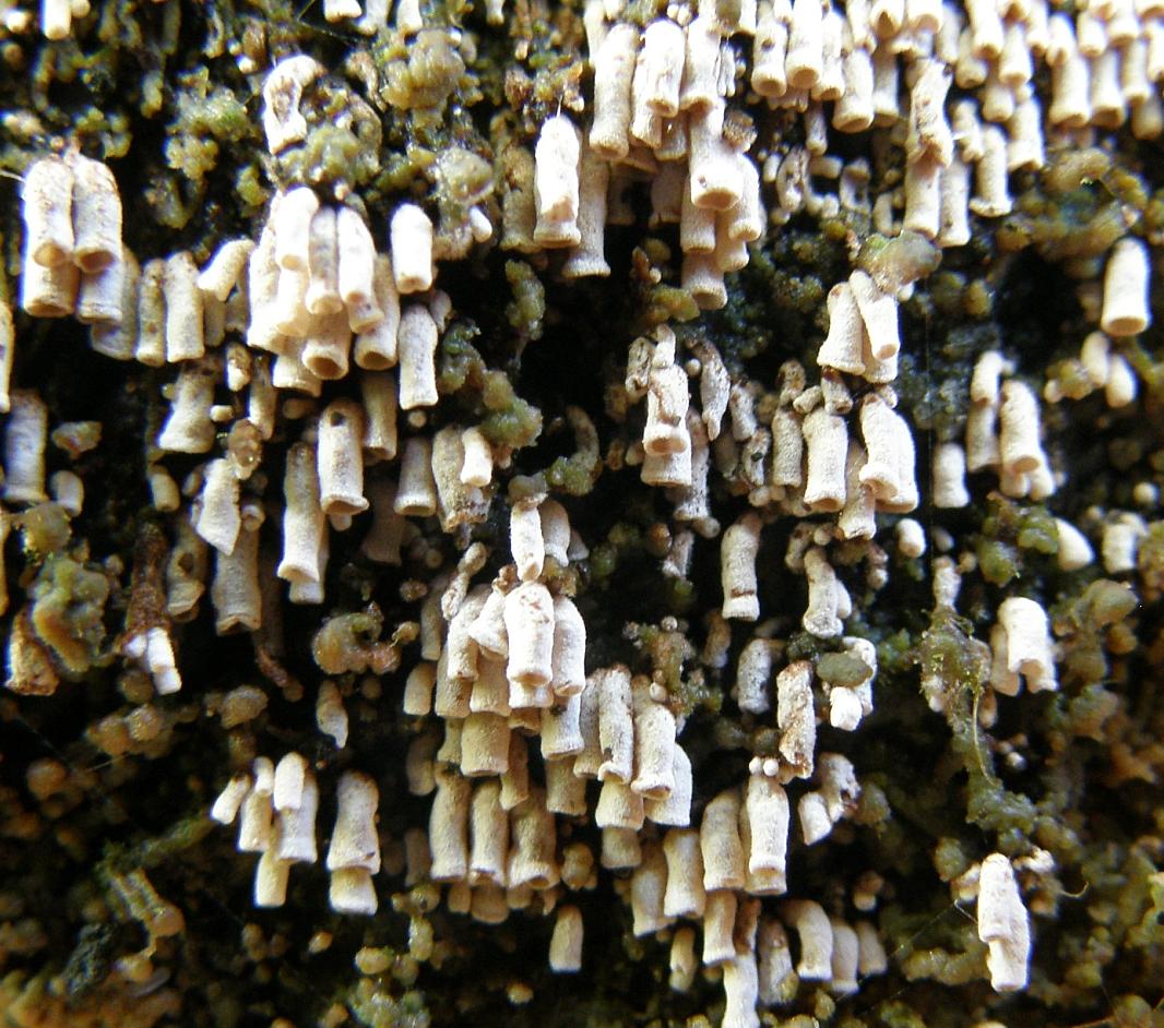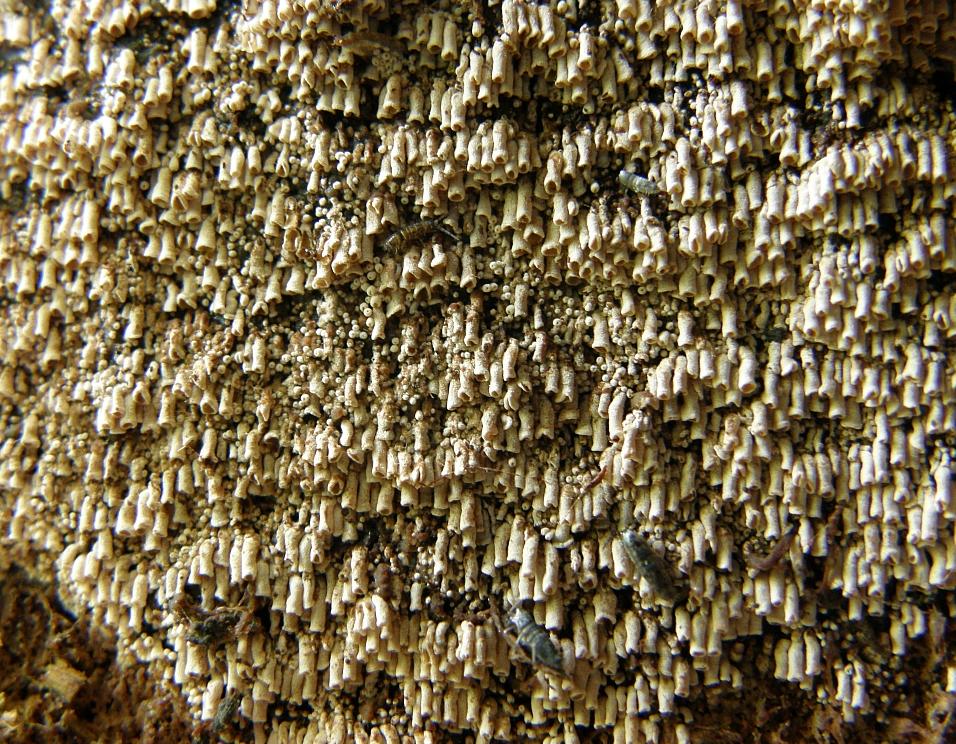 Diese Pilze sind ausgewachsen kaum zwei Millimeter lang, wachsen schön rasig, dicht gedrängt an einem Pappelstamm an der Schnittfläche. Da gehören sie eigentlich nicht hin, sondern an Tanne, aber das wissen die offenbar nicht.