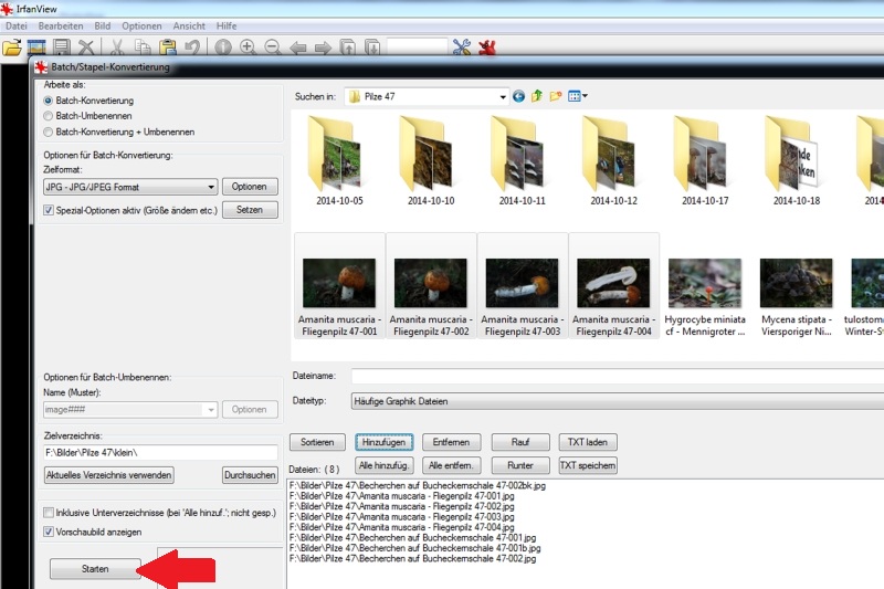 Irrfanview erlaubt es (und andere Programme können das auch), beliebig viele Bilder zu ausgewählten Konditionen umzuwandeln, zu ersetzen oder/und neu in an einem anderen Ort zu speichern. Theoretisch kann man alle seine Bilder in Abwesenheit automatisch derart bearbeiten lassen –“ man muss sie nur einmal auswählen und auf –žStart–œ drücken.