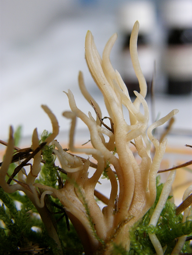 11 Jetzt wird es kurios. Da ich meine Nase ja eh gerade am Boden hatte, hab ich wie ein Trüfelschwein mal ein bisschen weitergewühlt und fand einige winzige klitzekleine Koralle, sie sieht aber dennoch irgendwie ausgewachsen aus. Sie war nicht höher als knapp 1 cm. Wuchs direkt auf dem nackten Boden im Moos. Hier waren dann auch die Grenzen meiner Kamera erreicht. Könnte das Ding in Richtung Ramariopsis subtilis gehen?