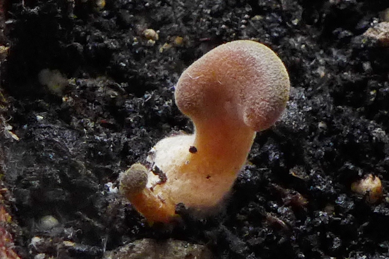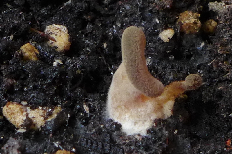 Schon seit einer guten Woche beobachte ich die 2 Fruchtkörper, in der Hoffnung, dass die noch etwas wachsen. Einen habe ich leider gemeuchelt (mit der Gießkanne berührt, umgefallen, wieder eingesteckt, ist natürlich nicht weiter gediehen, sondern bräunlich gammelig geworden).
