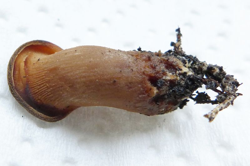 1. es war ein sehr langes Wurzelgeflecht ausgebildet (ungefähr so lang wie der Fruchtkörper), das habe ich erst mal entfernt mit dem unteren Pilzteil.