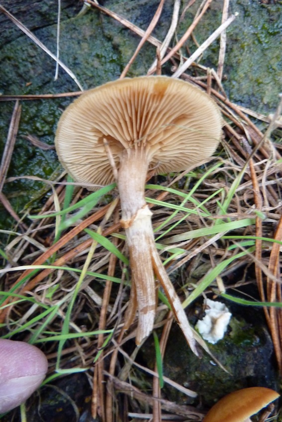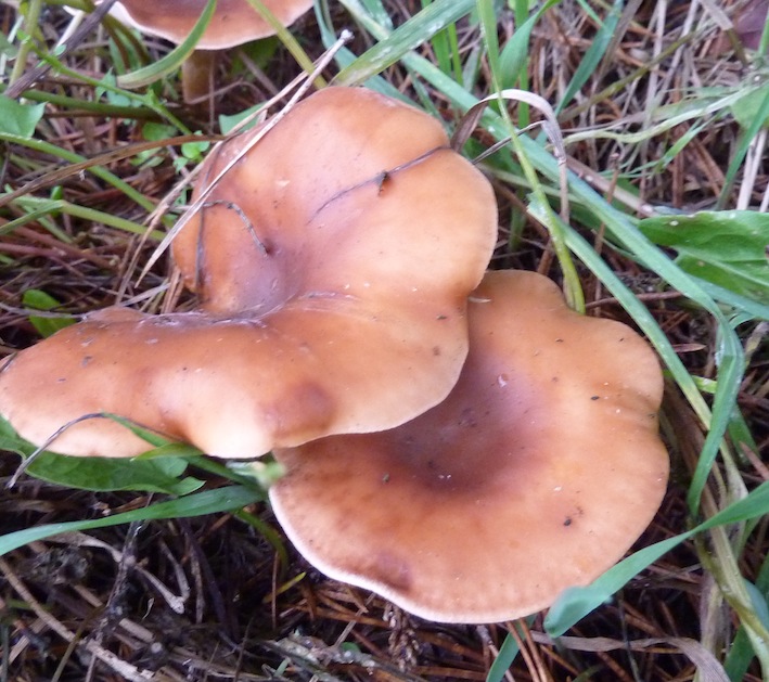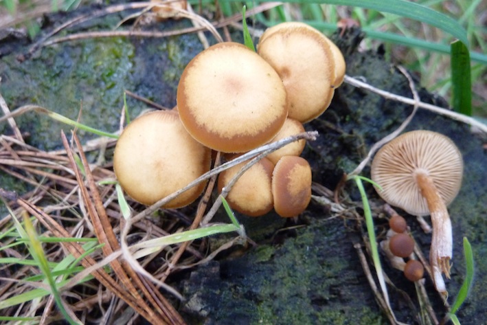 1. Häubling? Auf Kiefernstumpf und auch reichlich im Gras daneben.