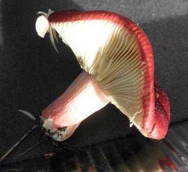 • Den ersten halte ich für einen Stachelbeertäubling, er hat ca. 12 cm Hutdurchmesser und ist kräftig purpurrot gefärbt, der Stiel ist rosa "angehaucht"