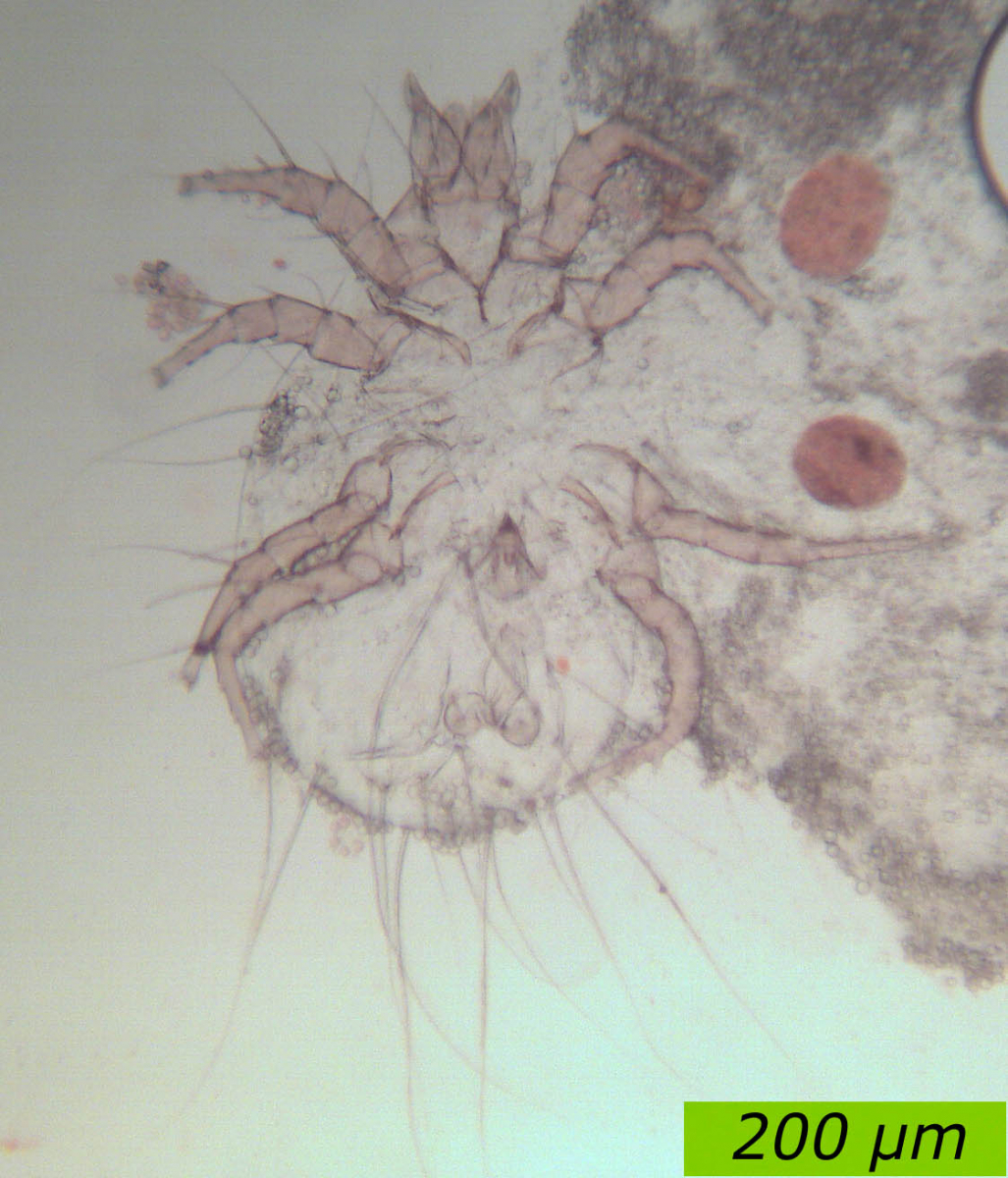 Die Milbe liegt auf dem Buckel und ist vom Deckglas erschlagen worden.