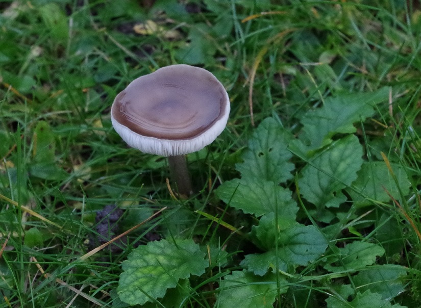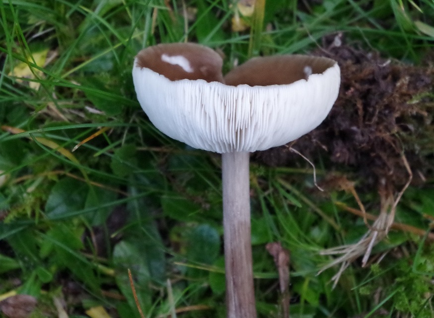 Von Weitem hatte ich ja auf den Mohrenkopf gehofft, aber dafür war der Hut zu hell sowie die Lamellen sich nicht am Stiel leicht fortsetzen, und keine Milch. Für den Rehbraunen Dachpilz passt die trichterförmige Hutform nicht, bei Rüblingen wurde ich auch nicht fündig, da hätten die Stielfarbe und die Lamellen wohl gepasst, Täubling vielleicht? Aber die Stielfarbe passt nicht–¦so häufig können solch schöne Kontraste zwischen Hut und Lamellen doch nicht sein..?..