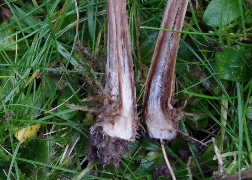 Stiel: längsfaserig bis leicht gefurcht, glatt, zur Basis hin etwas dunkler (bräunlich) als der obere Bereich, unten hohl, Hohlraum-Fasern mit weißlicher Farbe, dort faserig, der Aussenbereich des Stiel dunkelte bräunlich nach dem Schnitt (2 Min.), war aber auch direkt im Schnitt schon bräunlich, hauptsächlich zur Stielbasis hin, kein Stielring
