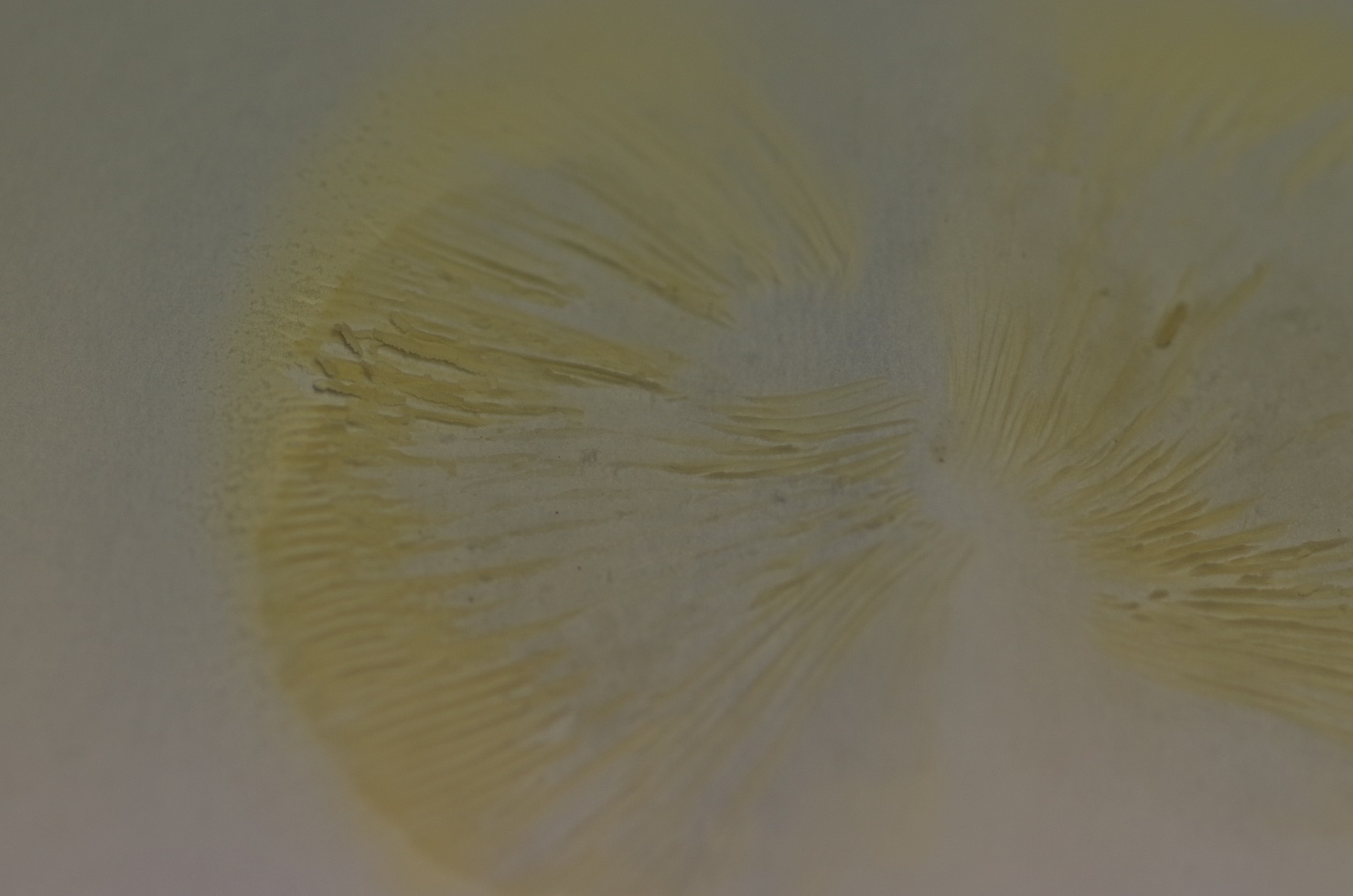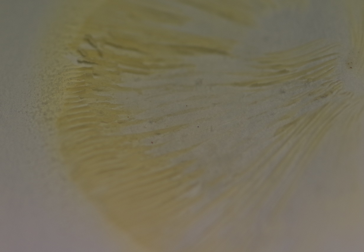 Lamellen: weiß-creme, engstehend, gegabelt, bauchig und ausgebuchtet (hoffe, dass richtig erkannt und beschrieben zu haben), Lamellen nicht leicht vom Hut zu lösen, dennoch weich
