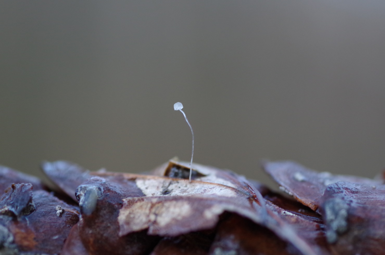 Und noch ein Bild, was eher von Komposition lebt, als vom Objekt selbst. Ein unbestimmter Helmling (Mycena spec.) zwischen kommenden Fichten (?)