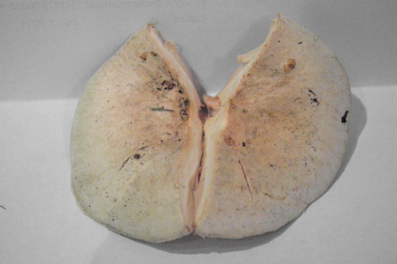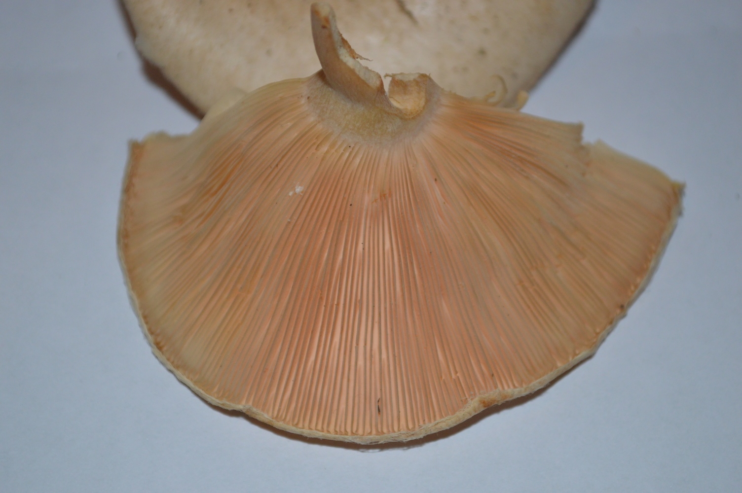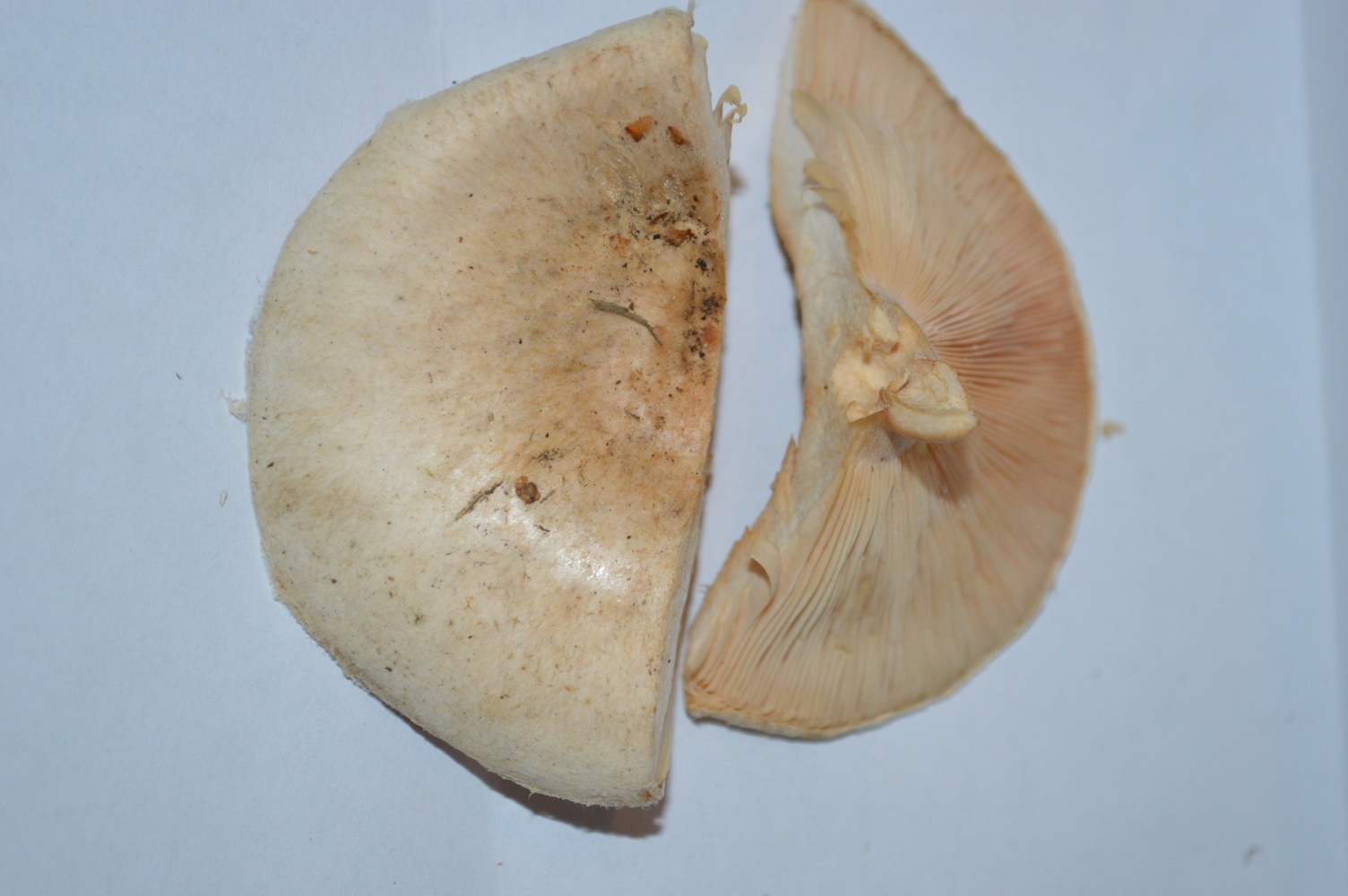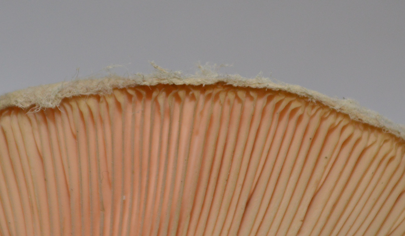 Nun weiß ich: Das ist ein Täubling oder ein Milchling. Beim Anschneiden milchte der Pilz nicht. Ich finde, an den Lamellenansätzen war er leicht feucht. Das könnte aber auch subjektive Wahrnehmung gewesen sein, damit der Pilz in die Milchlinge passt. Denn ich konnte partout keinen Täubling finden, der auch nur ansatzweise zu diesem Fund passt.