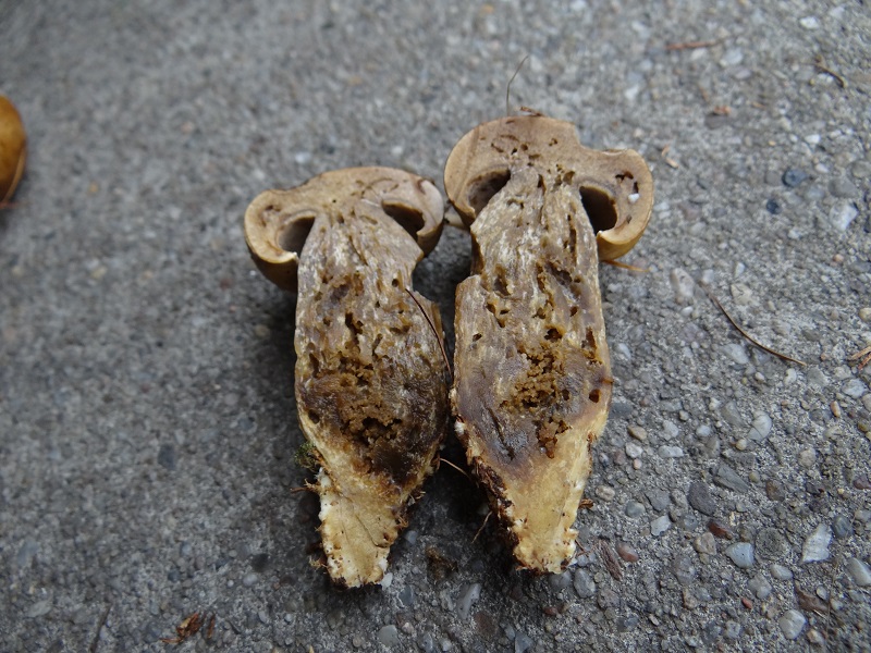 - Vermutung: Tja, die erste Assoziation war Sandröhrling wegen der Röhrenfarbe. Passt aber nicht, allein schon wegen der schmierigen Hutoberfläche. Grauer Lärchenröhrling passt nicht, weil ein Velum / Ring fehlt und auch der Habitus eher dagegen spricht. Die Röhren sind zudem zu klein. Was bleibt, ist die Möglichkeit, dass das Maronen (?) sind, die von einem anderen Pilz befallen sind. Vielleicht hat ja jemand eine Idee.