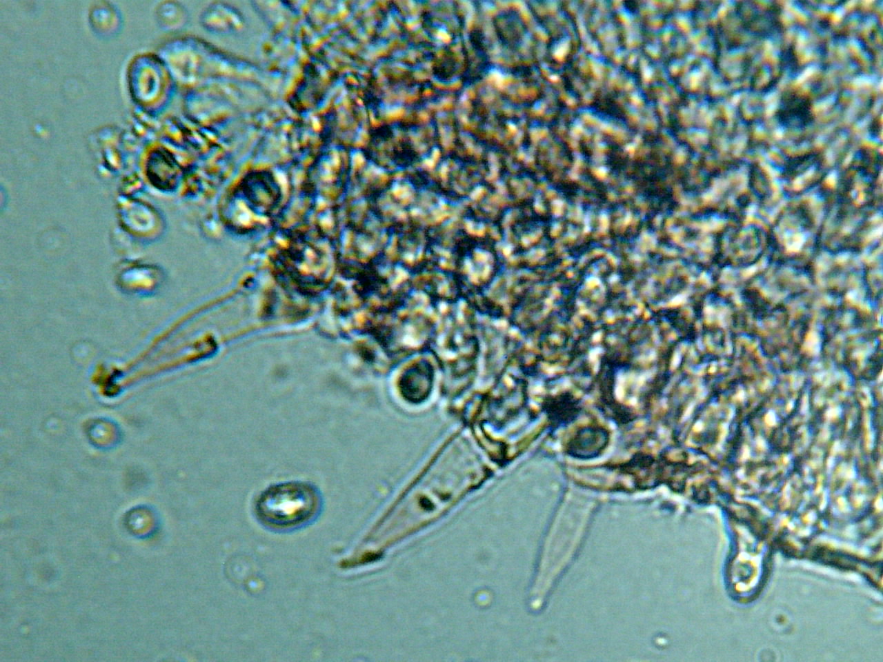 Zystiden: länglich mit Kristallkopf (lanzettenförmig - brennhaar?), 40 x 8 µm (2 Messungen)