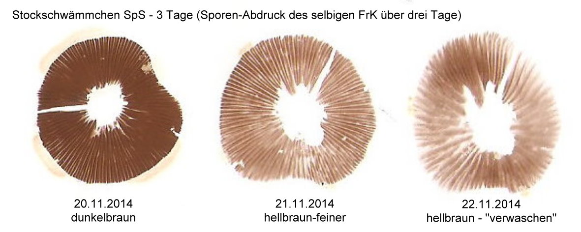 Was mich aber nun beschäftigt, inwiefern erleben wir so "verfälschte" Sporenabdrücke? Je nachdem, welches Altersstadium wir nun zum Sporenabdruck mitnehmen, könnten wir unterschiedliche Ergebnisse erhalten.