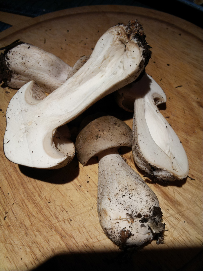 Für mich sieht das übrigens nach jungen Nebelkappen, Lepista Nebularis aus. Wenn man da nach Bilder googelt, finde man auch Exemplare mit dickerem Stil. Eigentlich sollten sie etwas (unangenehm) riechen, aber sowas kann variieren. Die sind gerade sehr häufig, die Chance ist also groß.