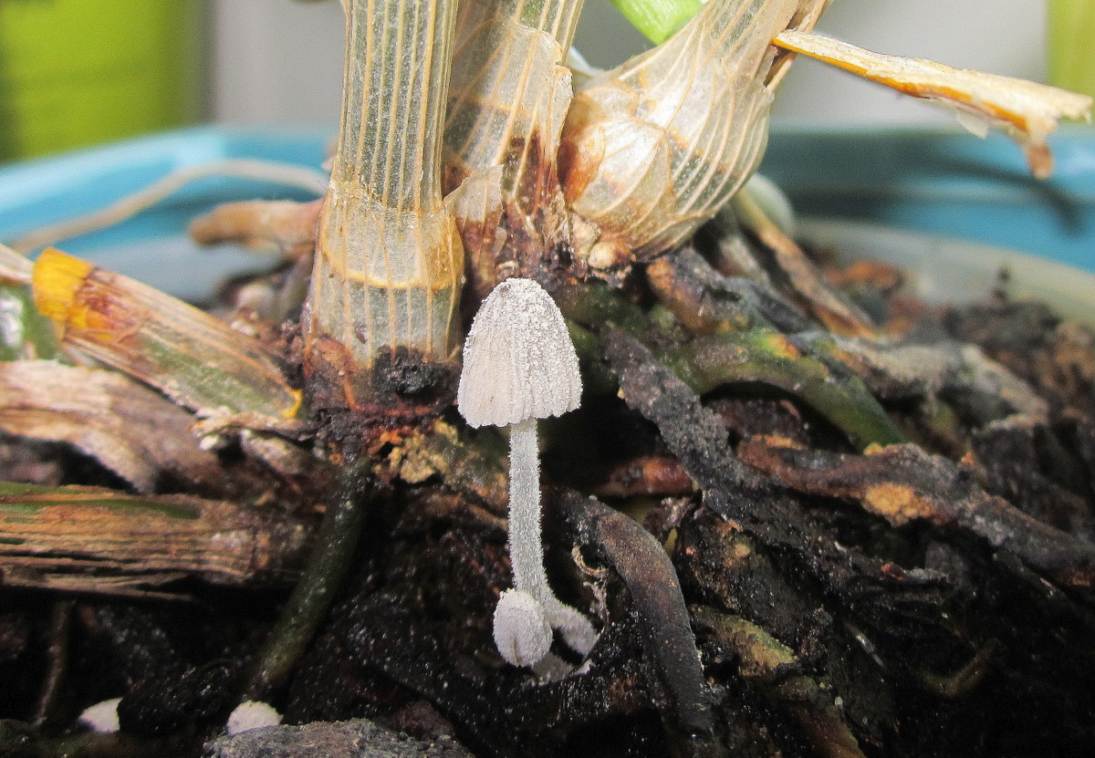 seit einiger Zeit wachsen auf dem Substrat (Rinde) meiner Dendrobium-Orchidee kleine weiße Rindenhelmlinge. Die Fruchtkörper werden bis 3 cm hoch und sind anfangs in allen Teilen weiß bepudert, später eher grau oder graubraun. Die Stielbasis ist scheibenartig verdickt. Die Sporen sind breitellyptisch. Eine genaue Bestimmung war mir bisher nicht möglich.