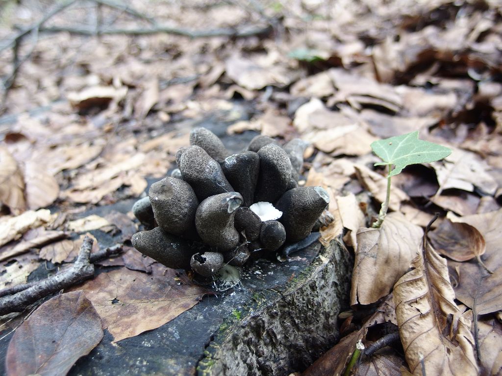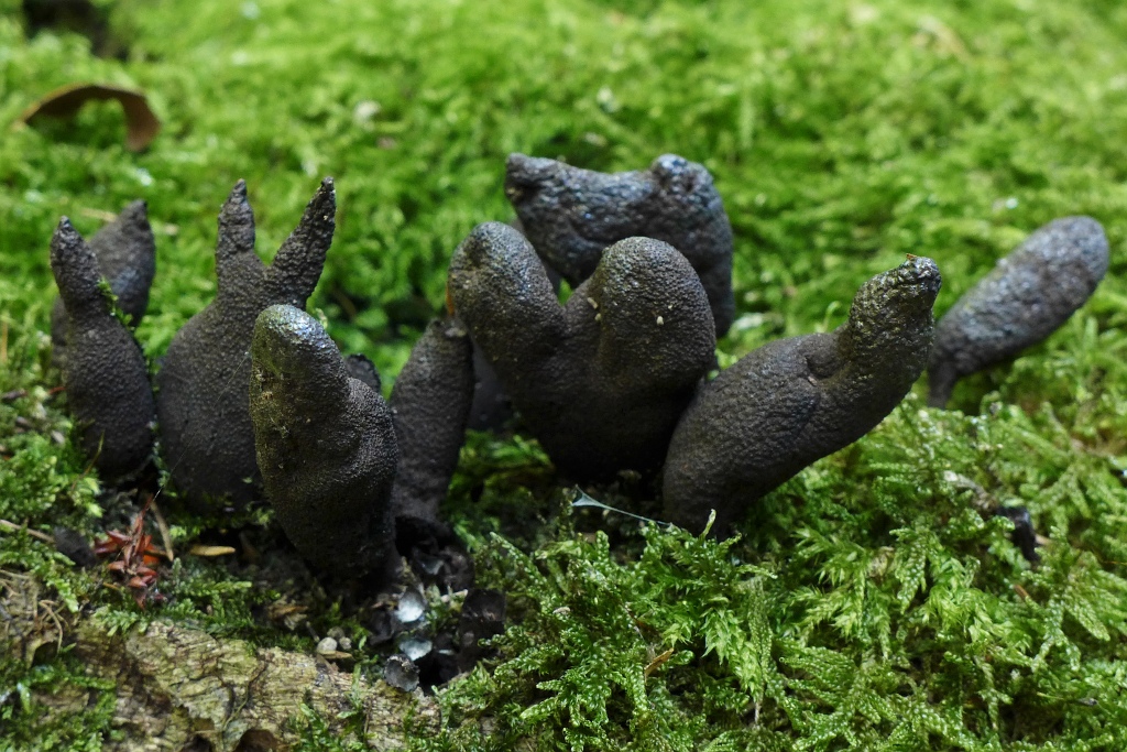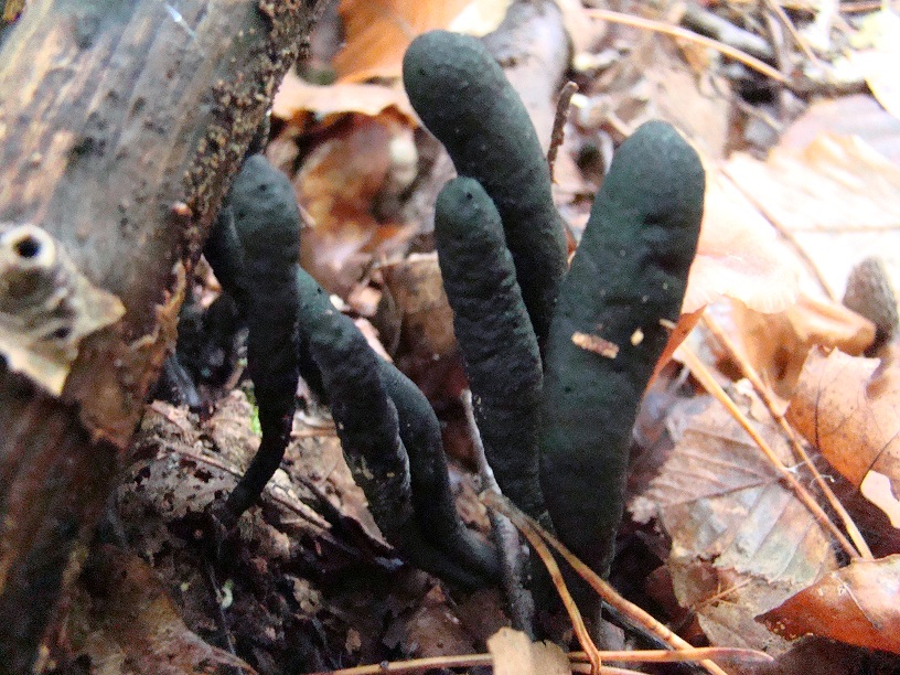 Ich würde Xylaria polymorpha (Veränderliche Holzkeule) sagen, weil es den hinteren "Fruchtkörper" gibt, und weil die Pilze auf einem Stamm wachsen.