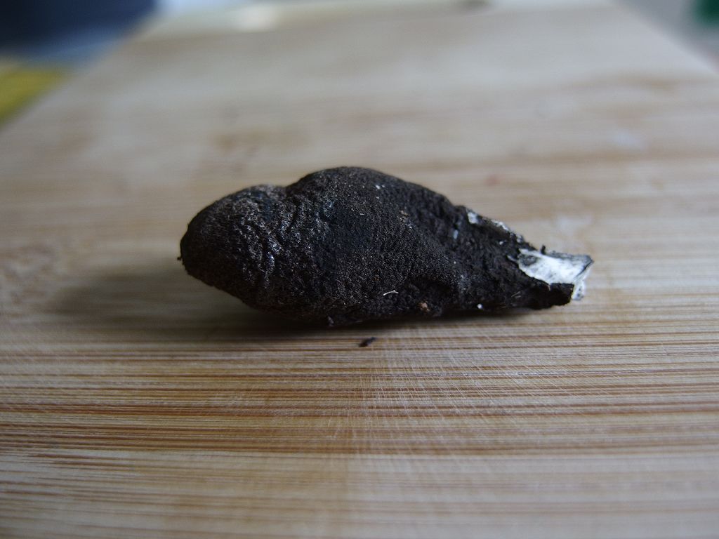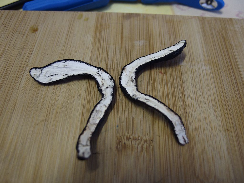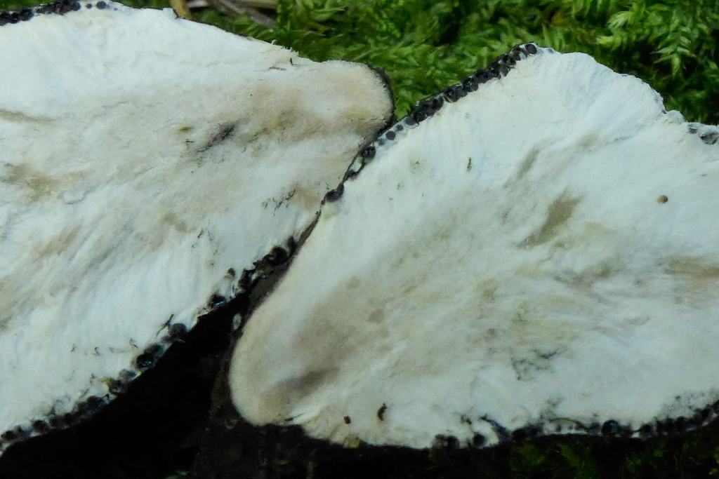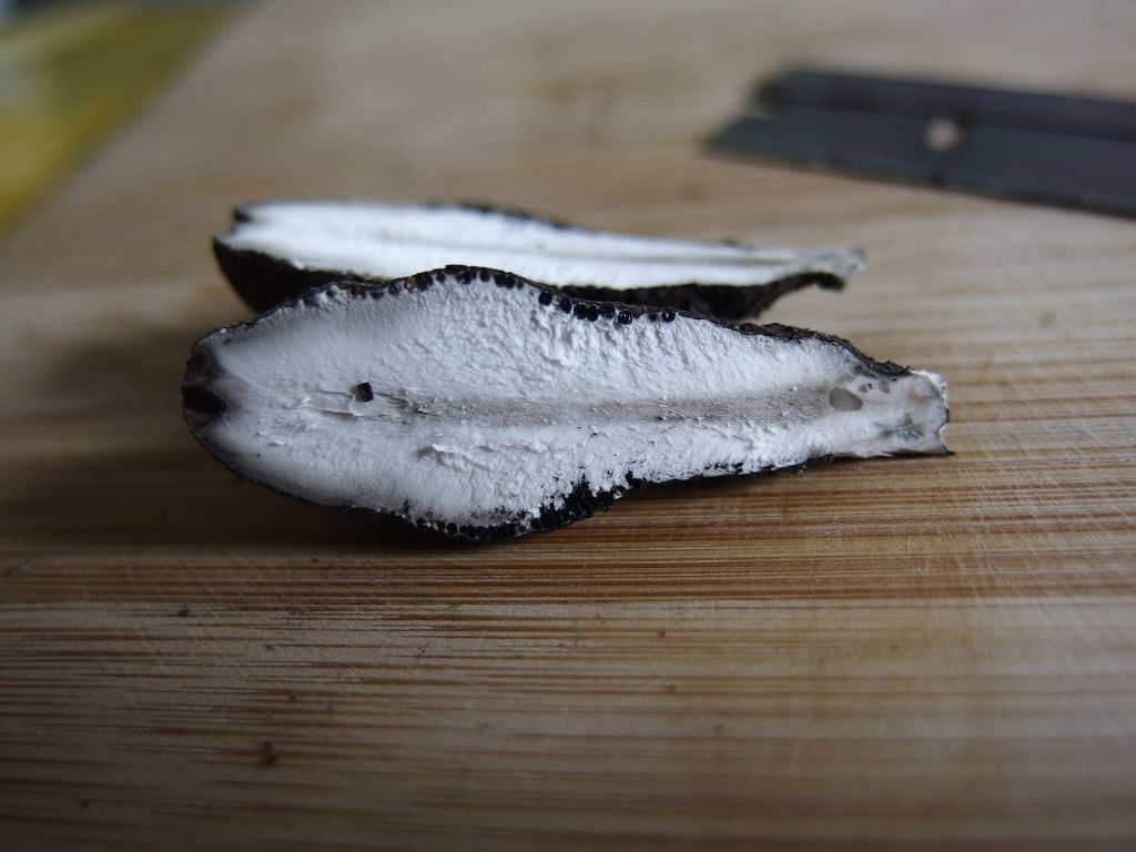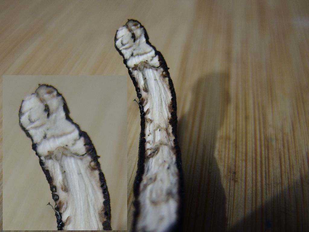 die aneinander gelegten Bereiche beider Stücke, die sich (ungefähr) in der Bildmitte befinden zeigen jeweils einen kleinen sterilen Bereich, es sind zwei (ungleiche) Hälften des Pilzes, "auseinandergeklappt".
