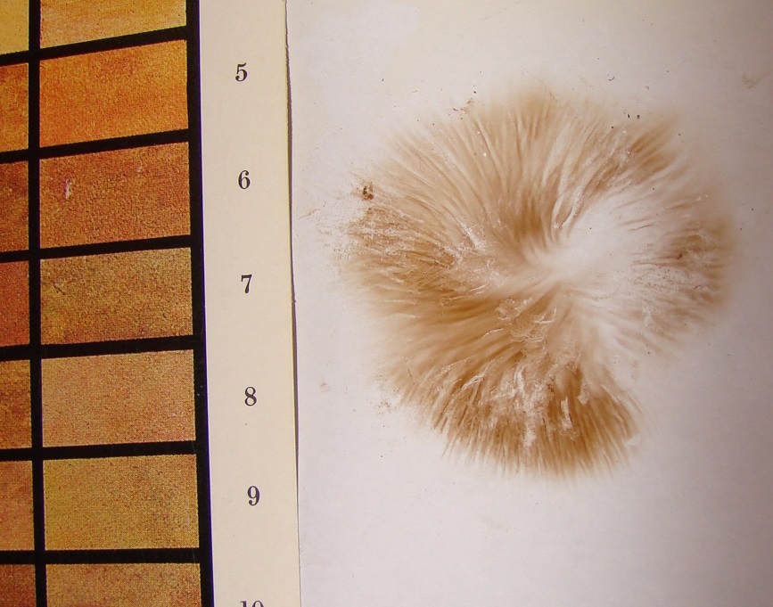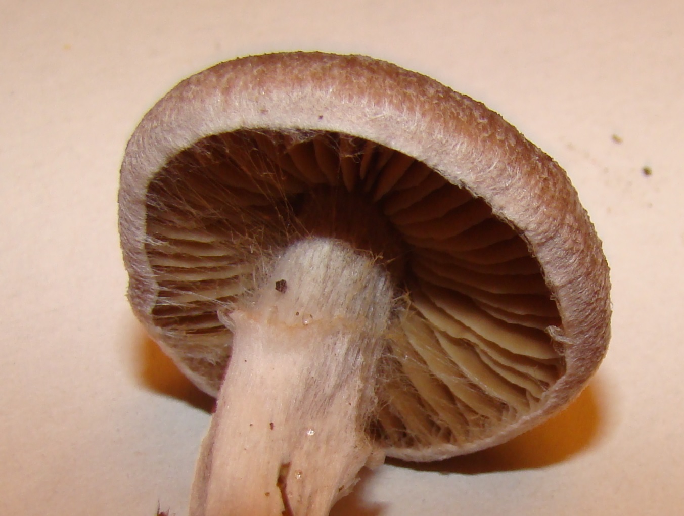 Nr. 3 - hier ein ziemlich kleiner, ca. 3 cm Duchmesser und hoch, habe unter Clitocybe und auch Paxillus gesucht aber nichts passendes gefunden. Evtl. ist es ja aber doch etwas ganz anderes. Der sträubt sich seit heute Vormittag auch noch gegen das Aussporen, ist evtl. noch zu jung - oder auch zu trocken? Auffällig jedenfalls noch das leicht spinnwebige am eingerollten Hutrand.