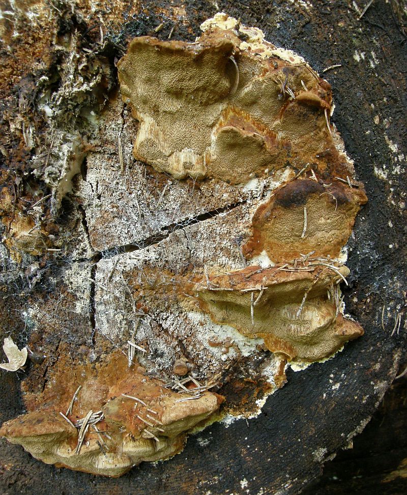 EDIT: ich ergänze nach Pablos Hinweis: Onnia - Arten (Filzporlinge) und Inonotus - Arten (Schillerporlinge) können opt. ähnlich aussehen, kommen überwiegend an Laubholz vor.