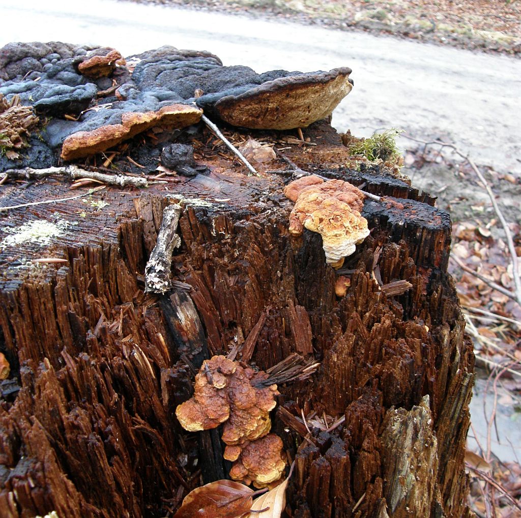 kein Schädling, da der Pilz ausschließlich an Totholz vorkommt und hilft, alte Stümpfe zu zersetzen, intensiver Braunfäule-Erreger, Färbung mit KOH schwarz