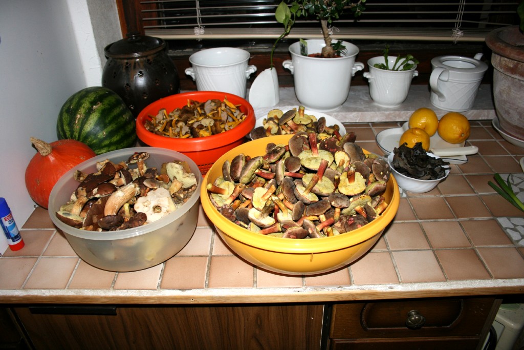 Mein Korb wog am Ende gute 5-6 kg und es gab u. a. echte Reizker, Perlpilze, Pfefferröhrlinge, Butterpilze, viele junge Maronen, Totentrompeten (für mich was ganz besonderes, weil ich davon mangels Laubbaum-Beständen nie mehr als eine Handvoll finde), Trompetenpfifferlinge en mas und an einer Stelle konnte ich meinen Augen nicht trauen: Herbstrotfussröhrlinge - so weit das Auge reichte, sicher mehr als 100 Stück... :) Fotos habe ich dieses Mal nicht so viele gemacht, weil ich schwer mit ernten beschäftigt war, aber hier mal die Ausbeute des gestrigen Tages...