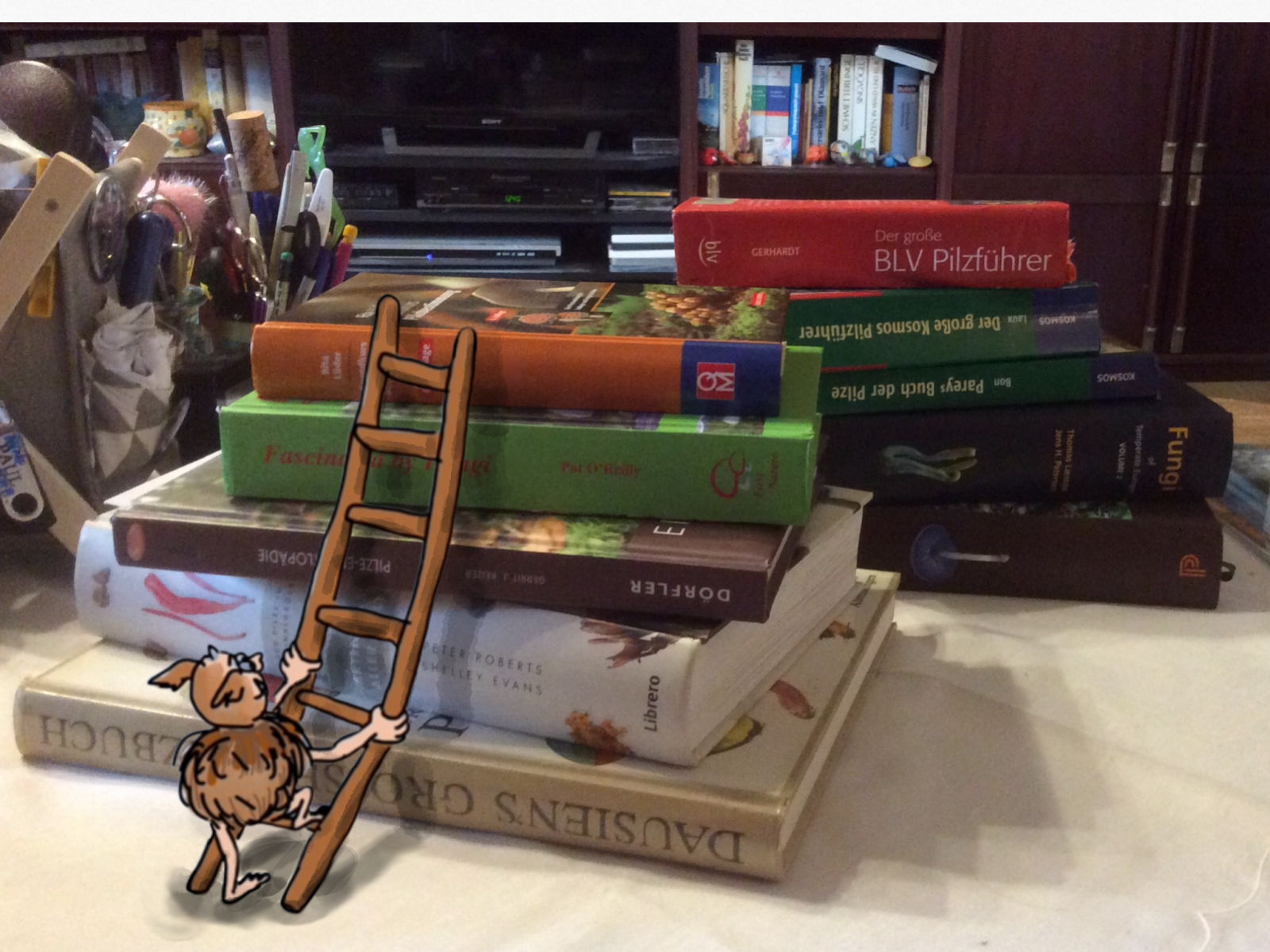 Nachdem Hessegnolm und sein Kumpel (welcher Gnolm das war, weiß ich gar nicht, vielleicht einer von Tuppies) die Lisd mit den Rätzelpilzen zu Gnorbert gebracht hatten, hat er die Leiter mit hierher gebracht...er keuchte beim Hochklettern: "Büchabeag hoooch is...Gnüni fiezufie Pizi-Bücha...dad'in all üba Pizis gelese hat...da'um Gnüni meint jetz, daß kei "KeiAhnung" mea, oda was?