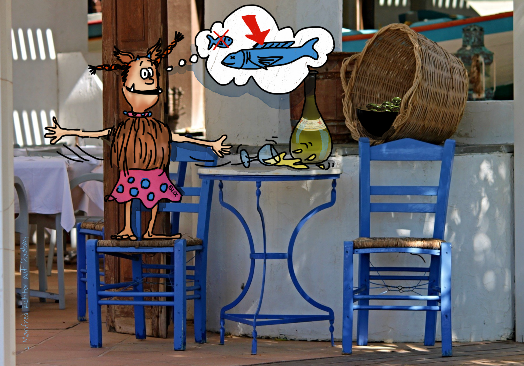 Besonders gut gefällt mir die Mischung aus Foto und Zeichnung, gerade die beiden Bilder oberhalb (Fani auf dem Stuhl und Spion-Gnolm) sind absolut klasse!