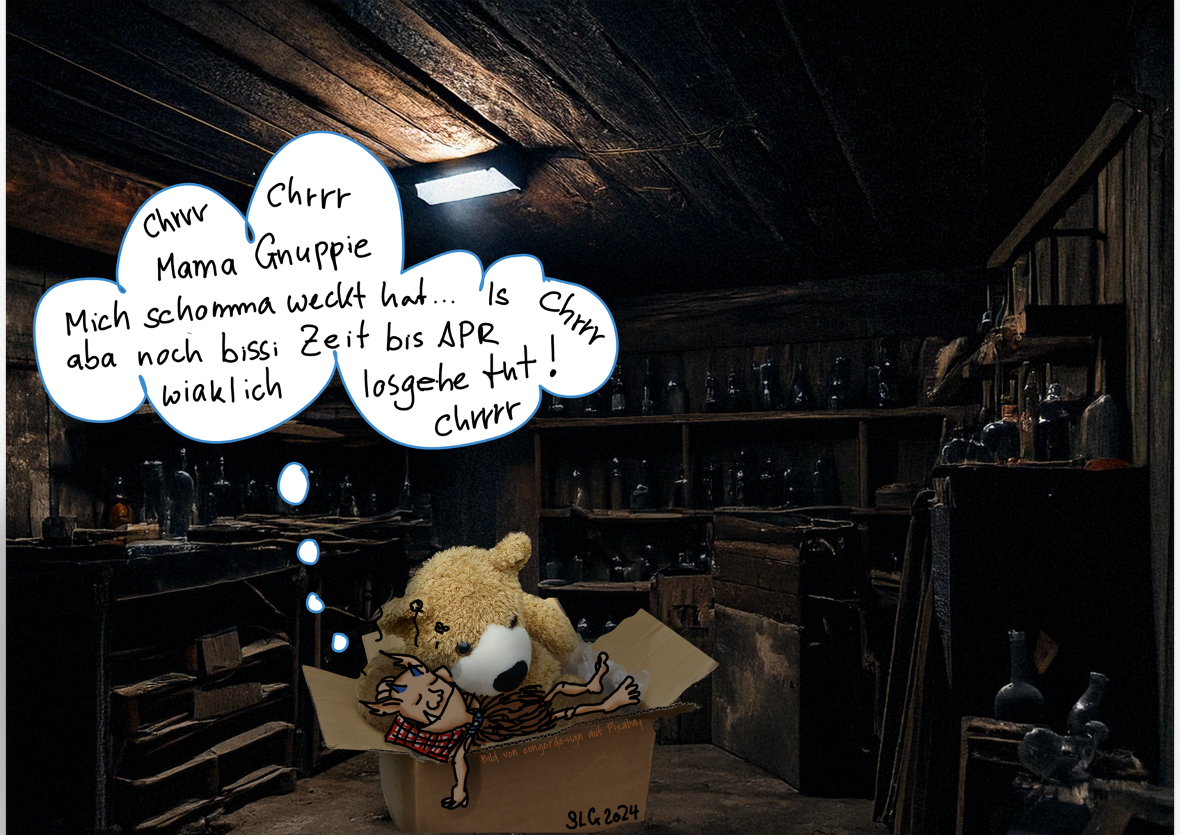 Im Gnolmheimer Kella gefällt es ihm aber der Kälte wegen viel besser. Beim lustigen Spiel mit dem Hausherrn Mista Tschii und Bläck Jäck schaut er auch nicht mehr so ernst.