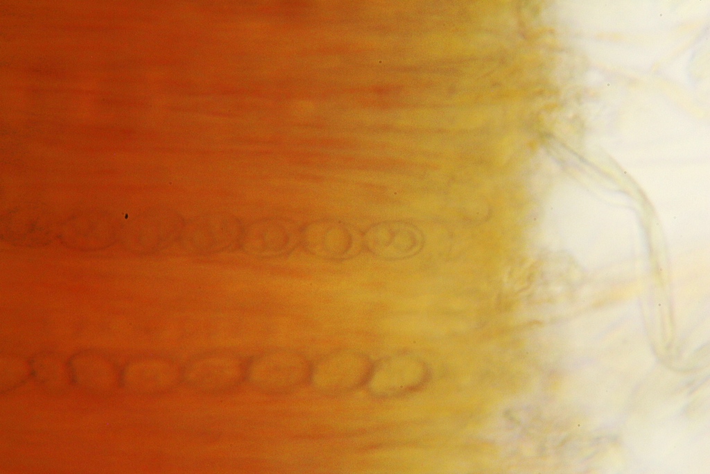 Zu Scutellinia sei noch gesagt, dass zur sicheren Bestimmung vieler Arten unbedingt das Betrachten mehrerer Fruchtkörper gehört. Also immer Kollektionen sammeln. Weiter findet man manchmal Sücke mit z.T. verkrüppelten Sporen, oder solche, bei denen ein Teil der Sporen im Ascus unterentwickelt sind. Die sind für eine Bestimmung nicht geeignet, da das Ornament verfälscht, oder die gesunden Sporen wesentlich größer als normal sein können.