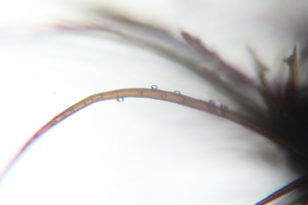Um die Haare anzuschauen, "schält" man vorsichtig die Fruchtschicht vom Rand ab und nimmt dann nur die dünne äußere "Haut". Dabei darauf achten, dass die Haare auf dem Objektträger nach oben liegen.