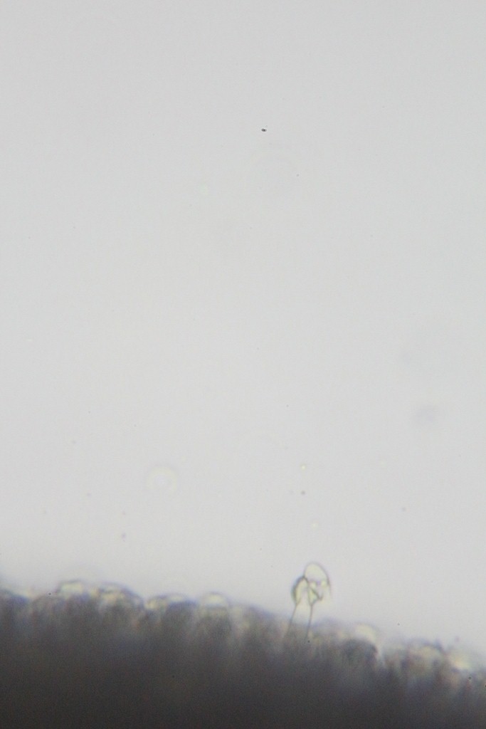 Querschnitte mache ich an einem auf dem Substrat festsitzenden Fruchtkörper. Erst in der Mitte teilen und dann mit der scharfen Rasierklinge eine Scheibe abschneiden. Je dünner, je besser, und nicht zu stark quetschen.