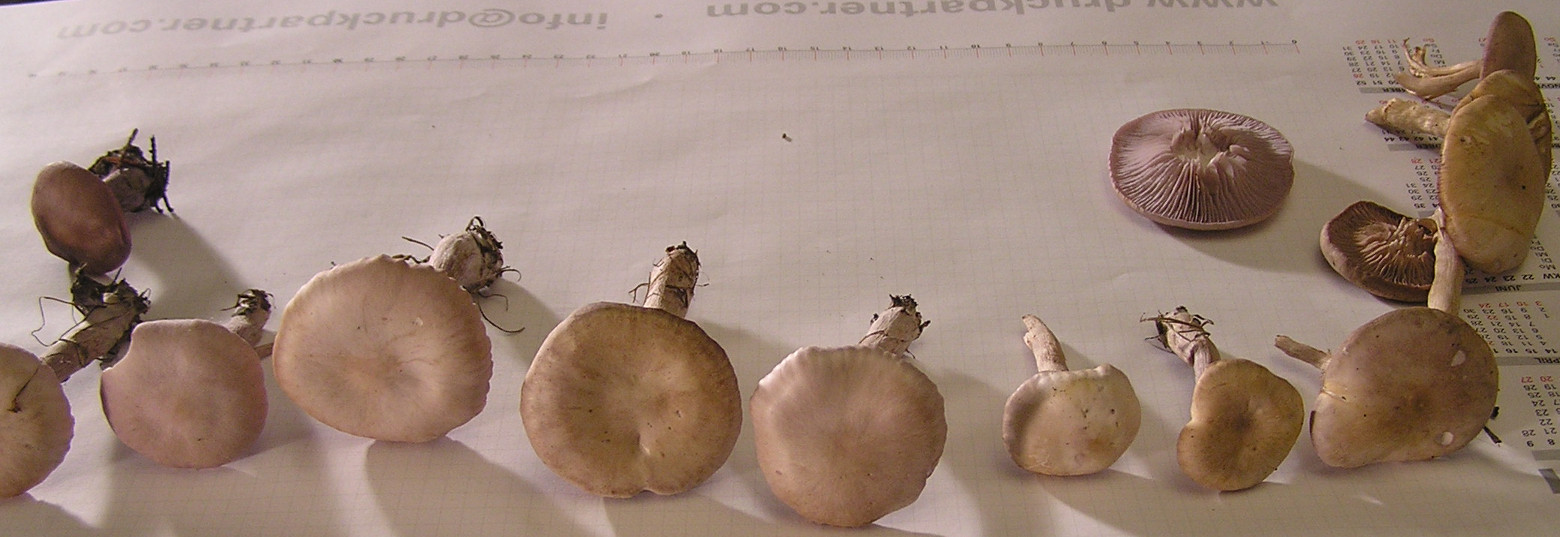 Soweit ich mich erinnere, hatte kein Fruchtkörper einen rosa Farbanteil. Das ging eher von zartviolett bis hin zu vielleicht gräulich-violett. Alle betrachteten Bilder von der lilastieligen Art (ich glaube personata) passen nicht zu meiner Erinnerung: Weder farblich noch von Stiel-Hut-Proportionen.