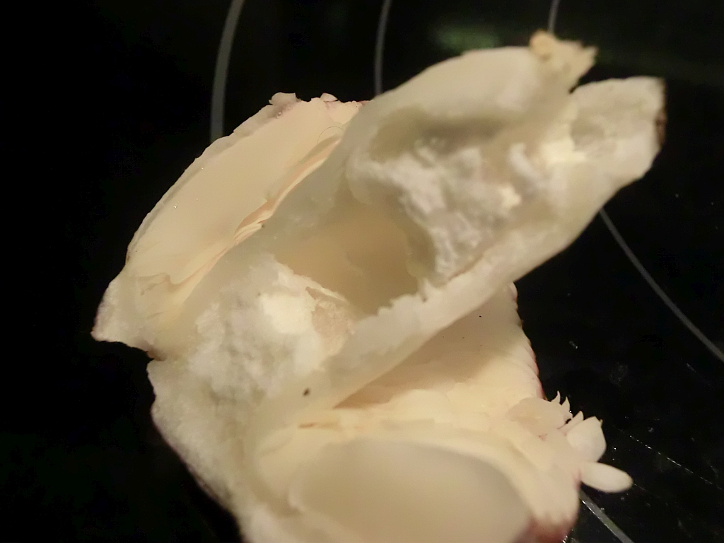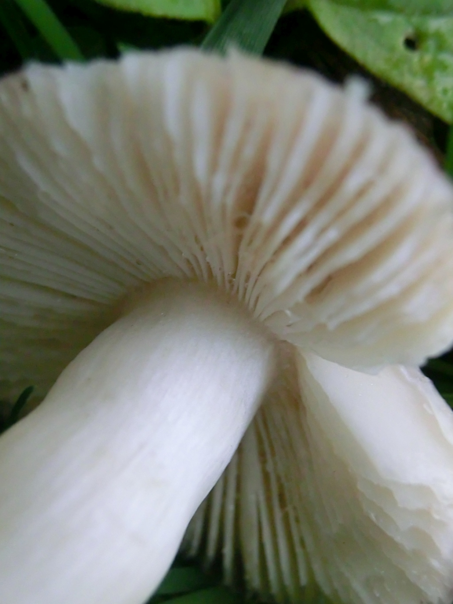 Die Hutfarbe geht ins Lila, die Oberfläche ist im feuchten Zustand klebrig-leicht schleimig. Fleisch ist weiß und "dick". Der Geruch ist einfach nur bäh - intensiv-eklig-scharf. Der Stiel ist hohl und leicht zerbrechlich. Ich konnte keinen im Ganzen raus bekommen. Jedenfalls ist das Ende nicht verdickt. Die Lamellen sind creme/gelblich und spröde. Wenn man mit dem Finger darüber geht, brechen sie gleich.