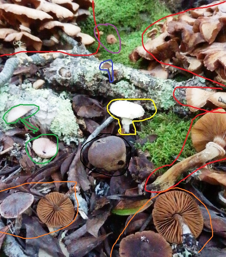 orange: die Pilze am unteren Bildrand (Schleierling (Cortinarius) aus der Untergattung der Gürtelfüße (Telamonia).