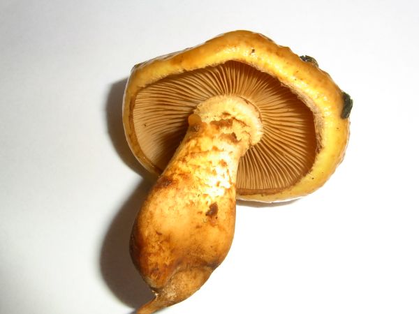 Hut: 5,5 cm Durchmesser, Gelb-orange Huthaut, extrem schleimig, keine Schuppen, Hutfleisch beige