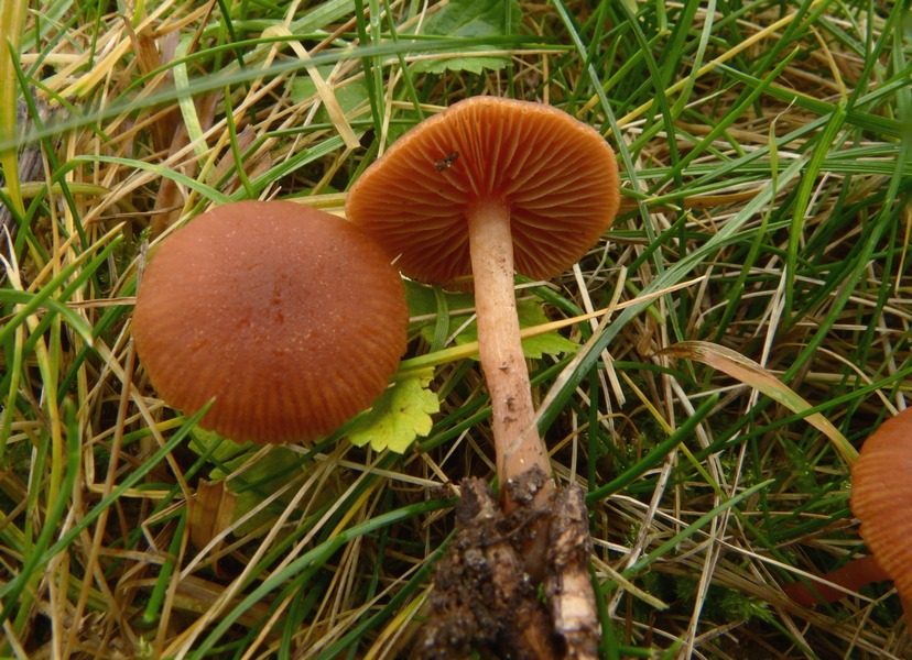 Anfänglich erinnerten mich diese Pilze an Laccaria - Hutgröße um 2 cm, gerieft, rotbräunlich, Lamellen braun, zum Siel hin eingebuchtet, dann aber breit angewachsen und mäßig engstehend, Stiel ohne Ring, Geruch kaum wahrnehmbar, etwas "pilzig" vielleicht.