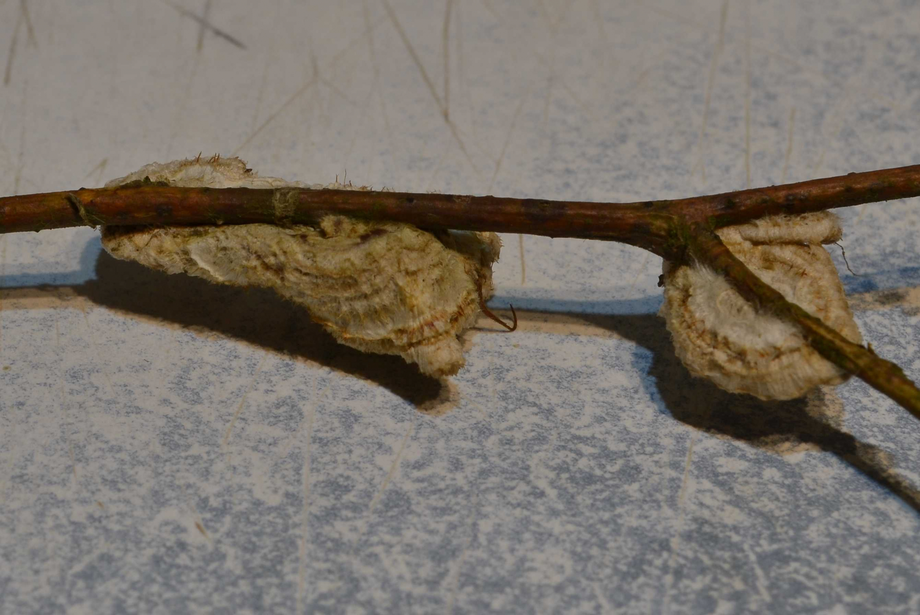 das ist Stereum ochraceoflavum, der Ästchen-Schichtpilz. Gut an den langhaarigen Hutfilz zu erkennen.
