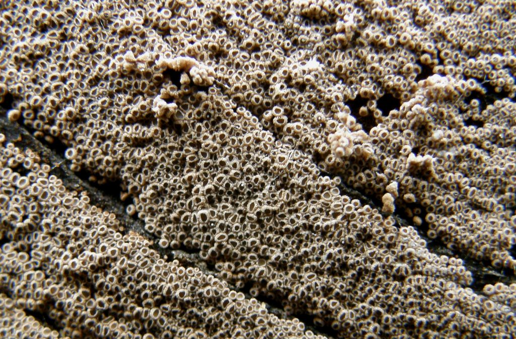 5. So, nochmal nachgelesen, diese Ingo-Pilze vergesse ich jetzt nicht mehr ;) Ein Rasen auf einem Buchenanschnitt. Wenn man die Lupe benutzt, winzige Becherchen! Winziger als ein Asco-Becher-Rasen daneben, aber diese hier sind Basidiomyceten.