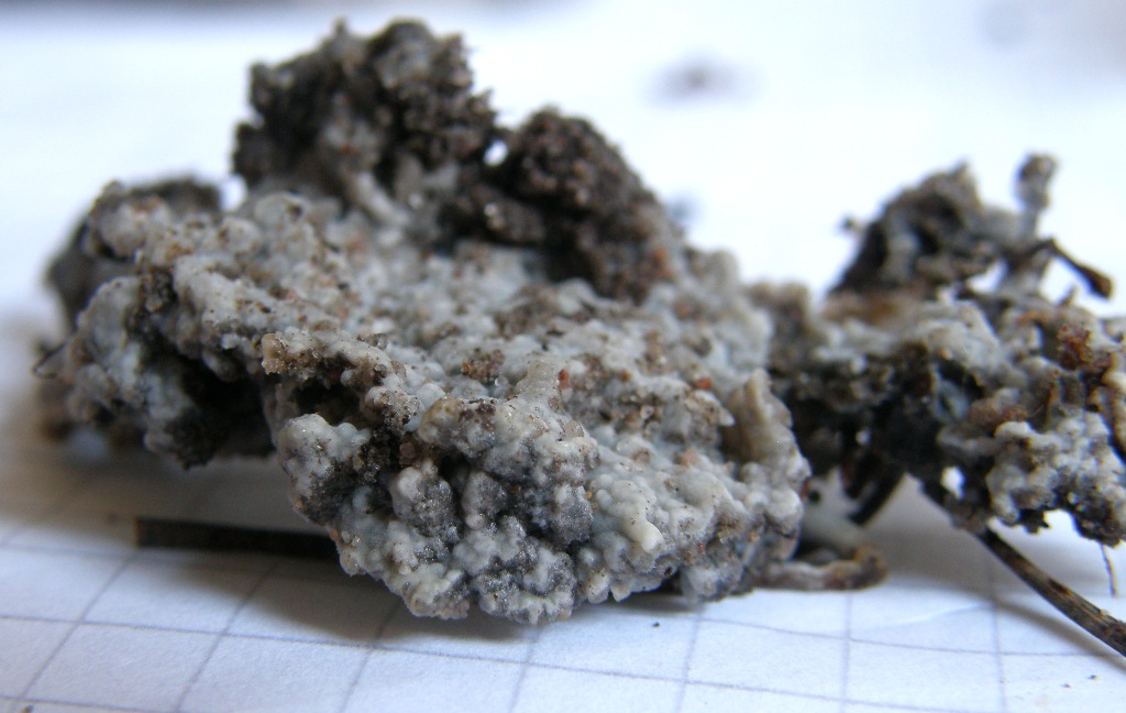 Wenn man die Lupe benutzt, winzige Becherchen! Winziger als ein Asco-Becher-Rasen daneben, aber diese hier sind Basidiomyceten.