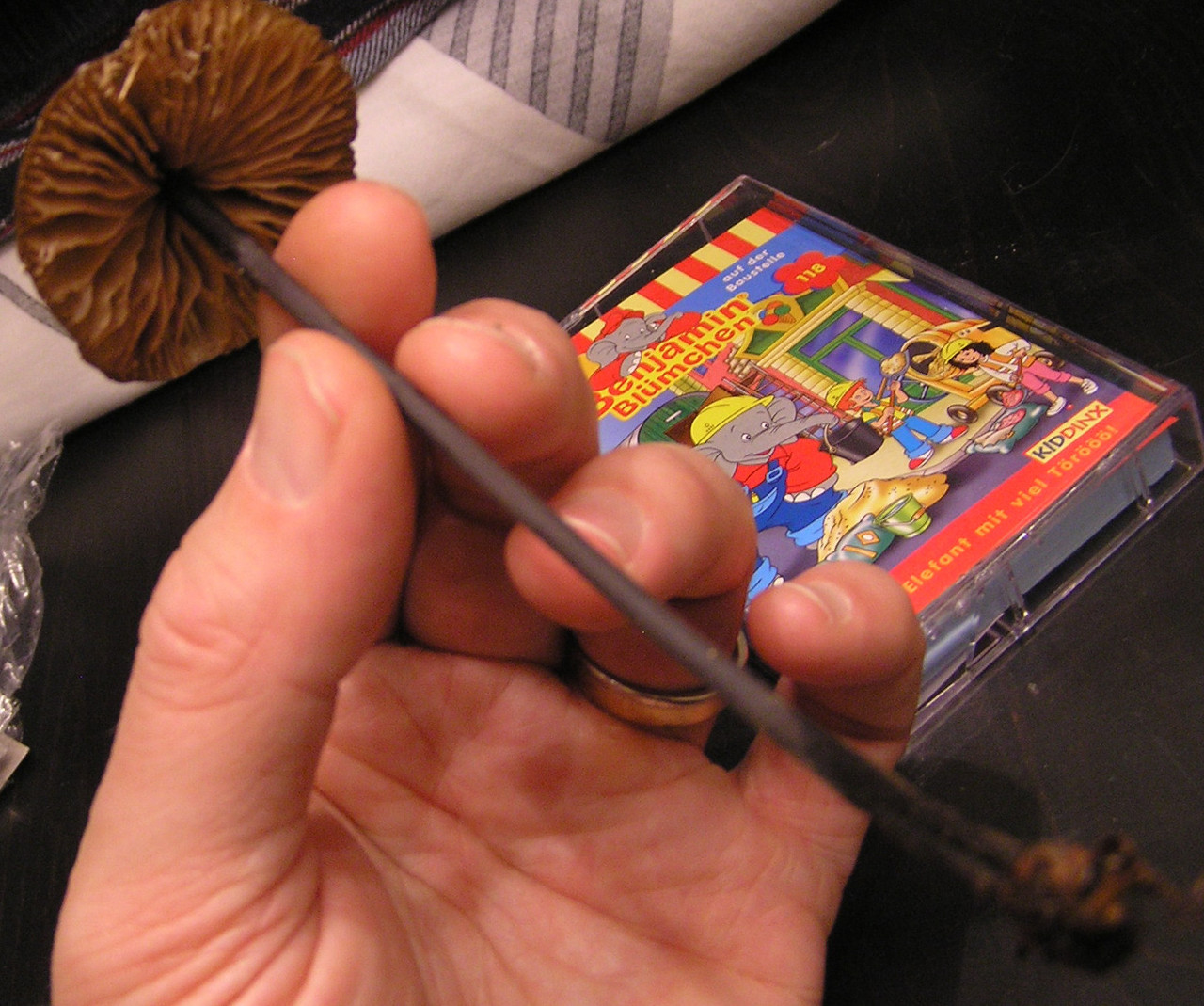 -Stiel etwa 10-12 cm lang, etwa 4mm dünn aber stabil wirkend, fast komplett schwarzbraun gefärbt (vielleicht auf den letzten 3-4mm vor dem Hut minimal heller), eher glatt