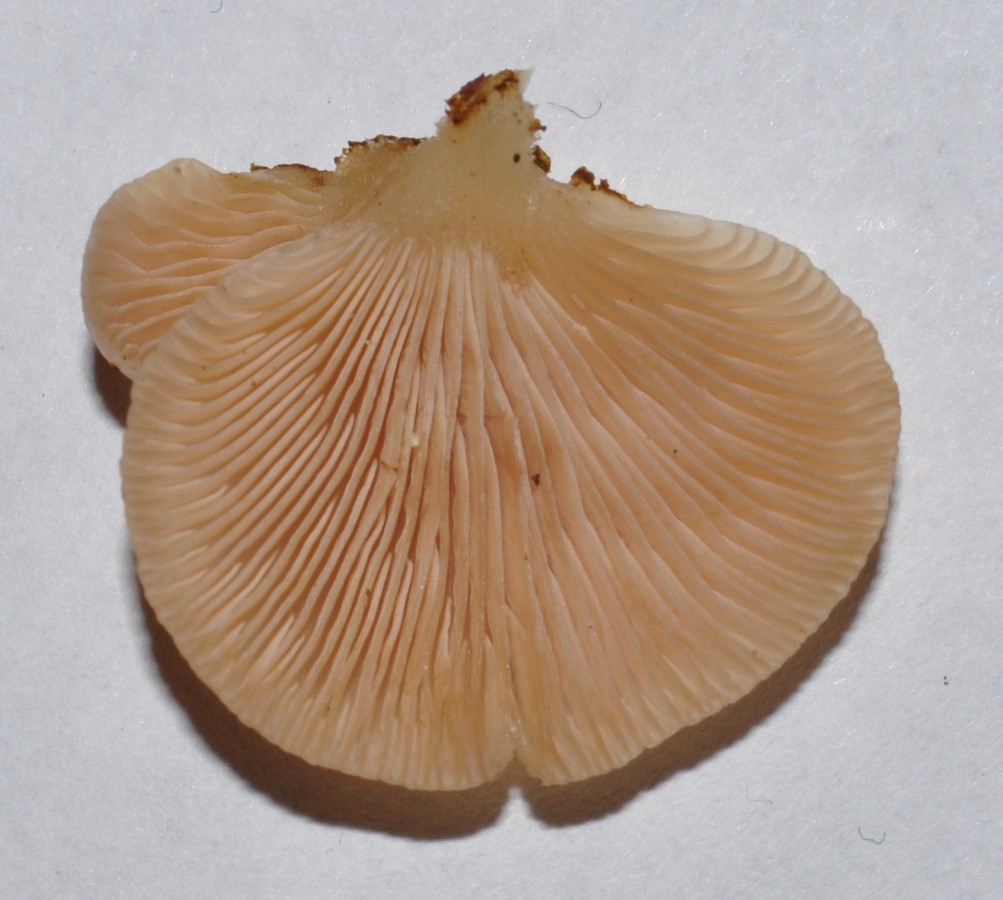 Zur Unterscheidung von Crepidotus - Arten (die auch gerne an Nadelholz vorkommen können, und bei C. mollis auch eine gelatinöse Huthaut haben) kannst du auch die Farbe des Sporenpulvers prüfen. Und eben den Stiel: Der ist bei Crepidotus (und auch bei Hohenbuehelia etc) meist nicht vorhanden. Hier ist er gut zu sehen und die Lamellen vom Stiel typisch Panellus - mäßig abgegrenzt.