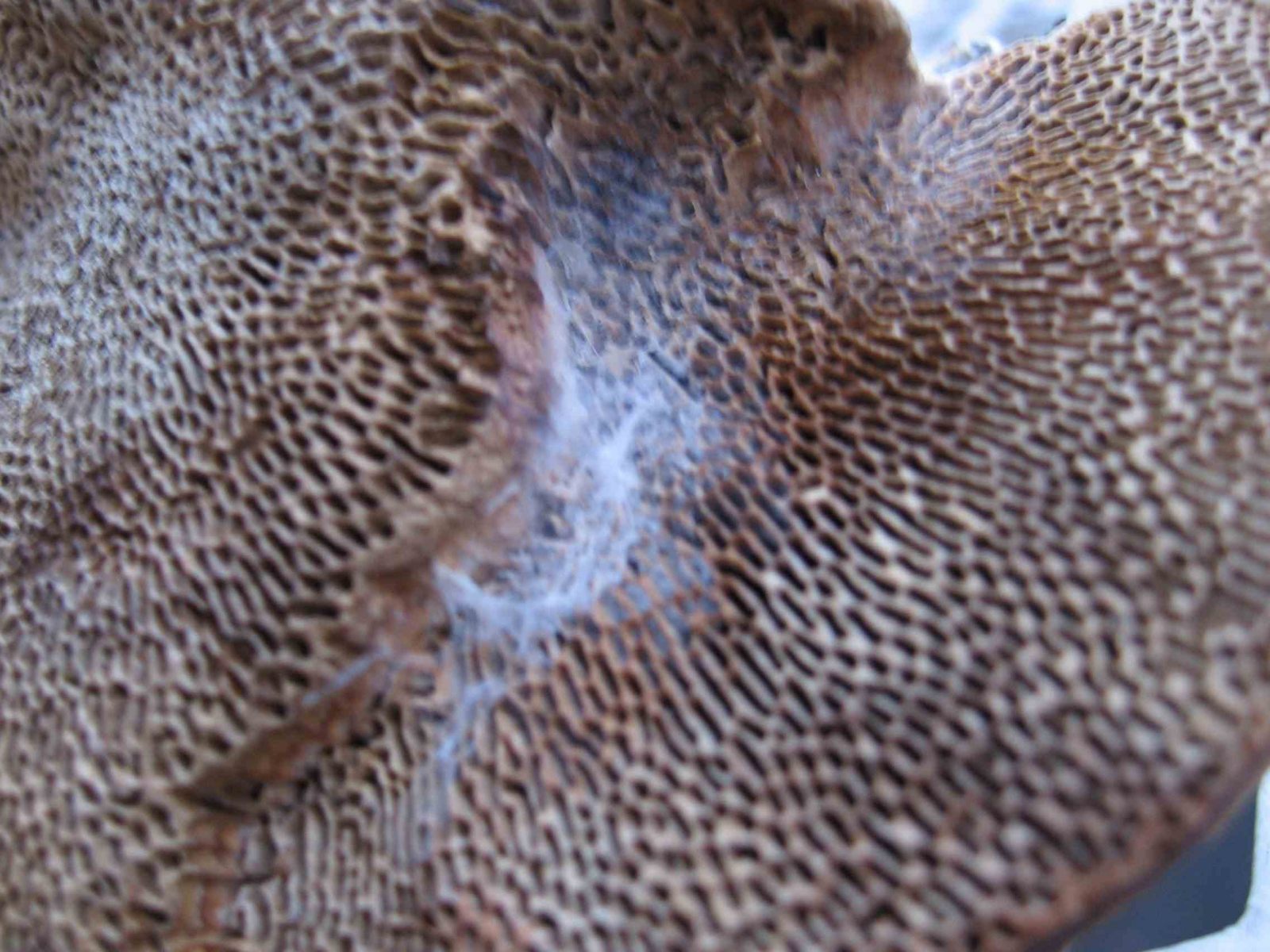 Die Unterseite ist ockerbräunlich und verfärbt sich auf Druck dunkelbraun. Die Porenschicht ist quasi terrassenförmig abgesetzt, an dieser Stelle ist weißes Myzelgeflecht sichtbar. Die Poren selbst sind allerdings deutlich oval, in der Literatur sind sie eher als rundlich beschrieben: