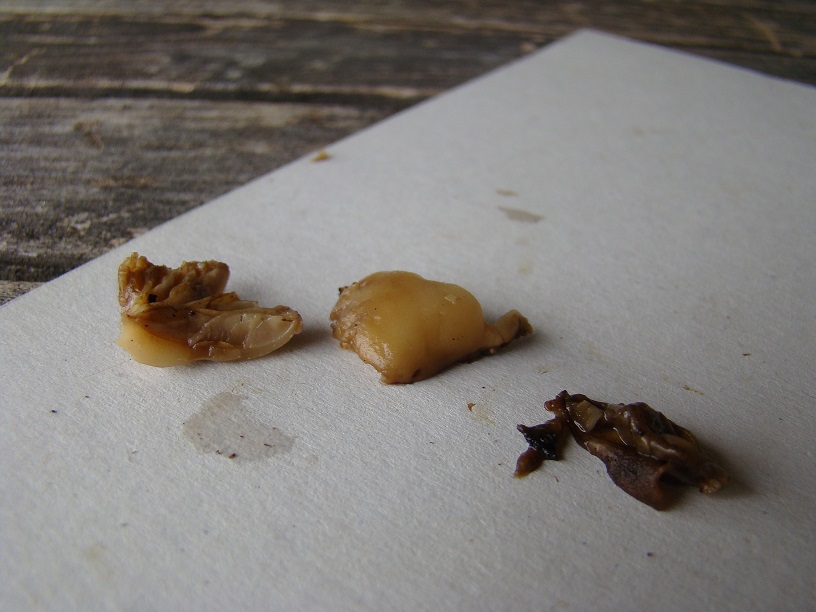wie versprochen habe ich das Stummelfüßchen nochmal eingeweicht - die dünne Huthaut ließ sich danach auch prima abziehen. Ist der dunkle Haufen rechts auf dem Foto. Beim Auseinanderziehen war sie auch wirklich schön gummiartig - damit sollten wir also doch noch bei Crepidotus mollis rausgekommen sein, oder? :):)