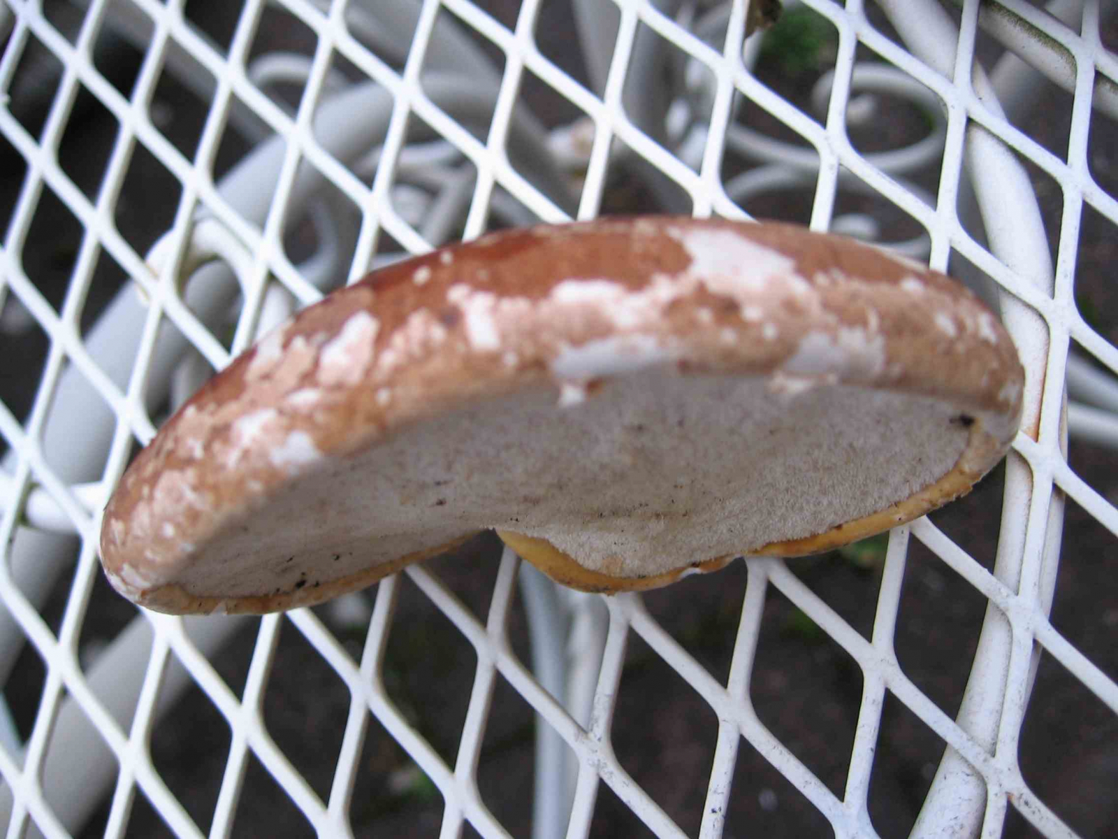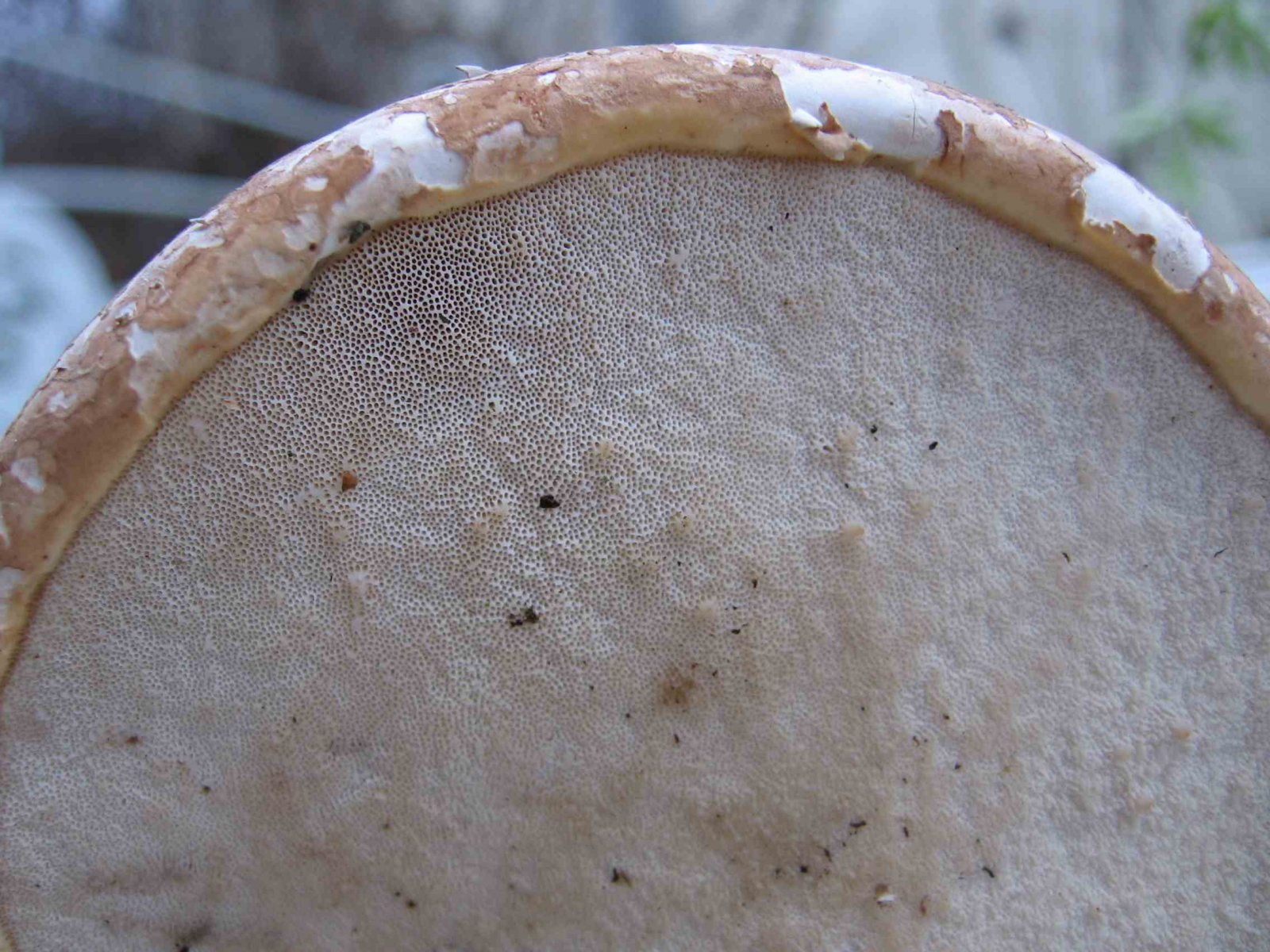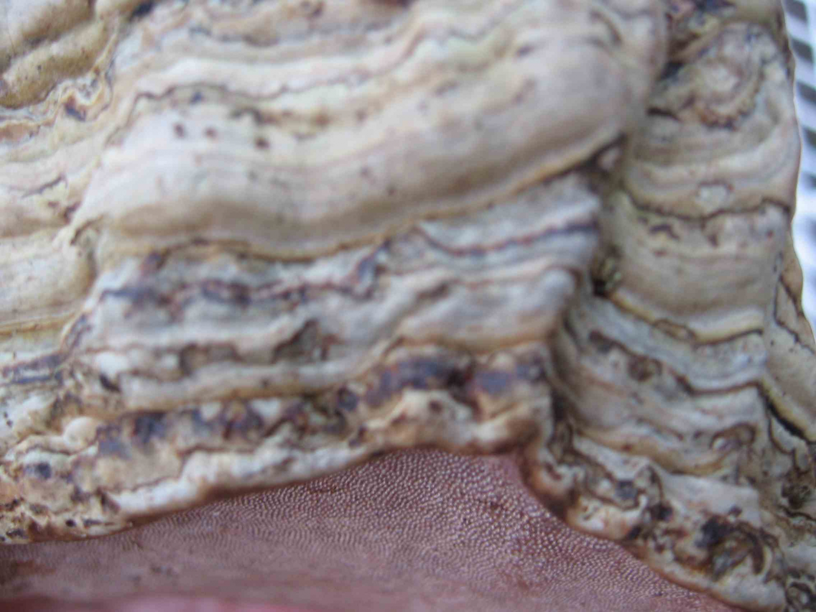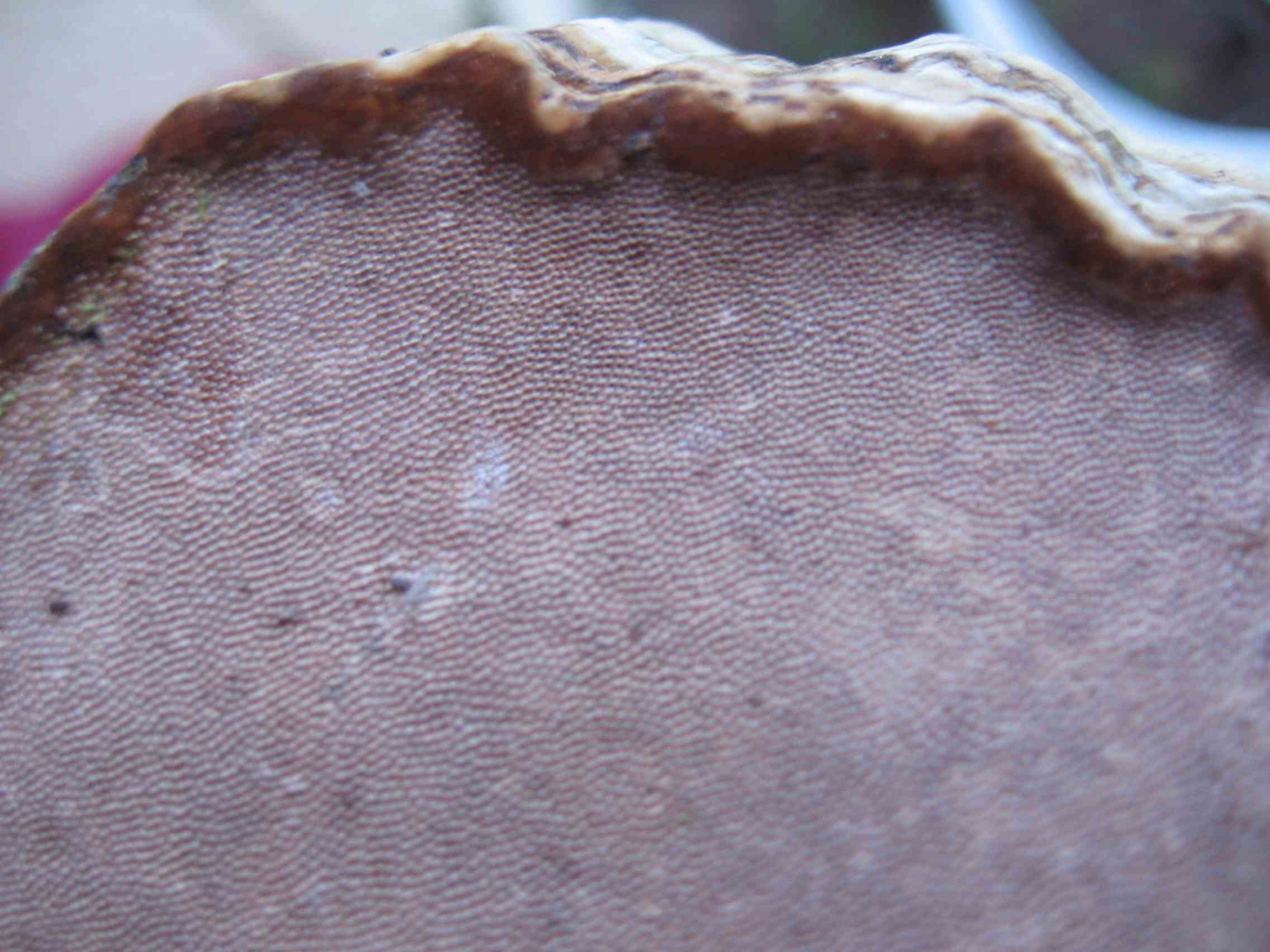 Die Poren sind winzig, kaum als solche zu erkennen, ihre Farbe ist ein helles Graubraun mit einem leichten Stich ins Fleischrötliche - auf dem folgenden Bild haben sie (warum auch immer) einen lila Stich, der aber nicht der echten Farbe entspricht. Sie verfärben sich nicht auf Druck, aber die Unterseite des Pilzes ist auch so hart, daß man sie nicht mehr eindrücken kann. Die "Rinde" umrahmt die Röhren mit einer dunkelrotbraunen Linie: