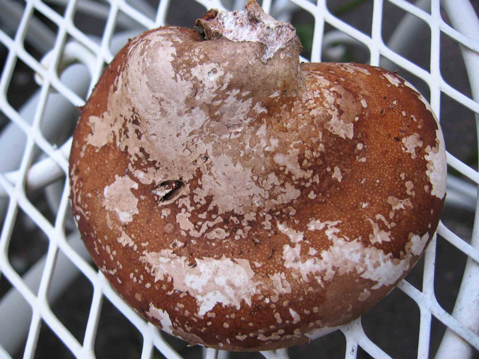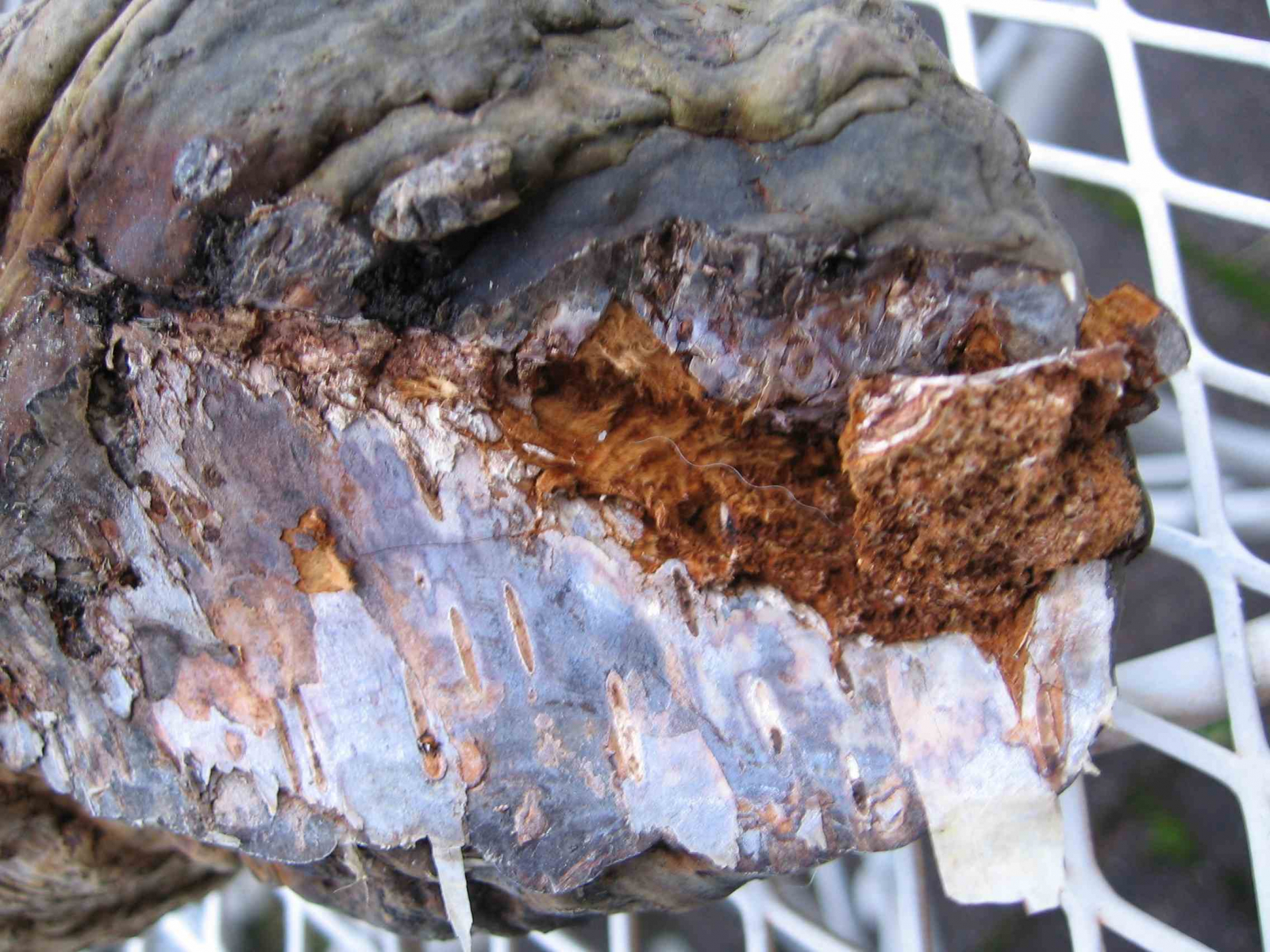 Hier die Anwuchsstelle, an der man noch Reste der Birkenrinde schimmern sieht. Hier ist der Pilz beim Entfernen etwas aufgebrochen, die holzbraune Schicht sollte m.E. die Trama darstellen.