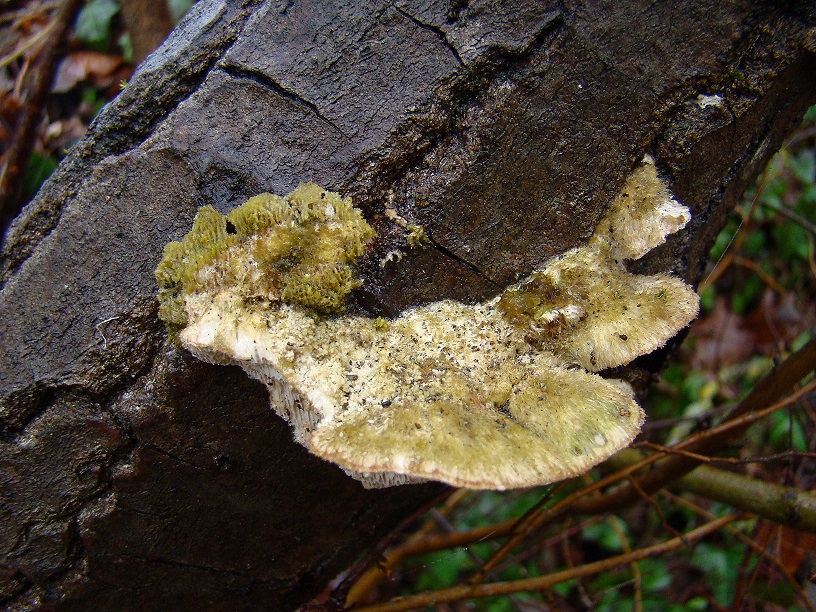 2. Trametes (=Coriolopsis) trogii - Blasse Borsten-Tramete, wohl auf Pappel-Ästen. Nach unser Diskussion von neulich über das Thema Coriolopsis trogii vs. Trametes hirsuta Hier denke ich richtig zu liegen, insbesondere wegen der eher bräunlichen "unordentlichen" (dank für den Hinweis an abeja) Hutbehaarung, die eher unregelmäßigen etwas weiteren Poren und das völlige Fehlen einer Zonierung des Hutes. Das Fleisch ist auch nicht weiß sondern eher hellbraun, mit irgendwie haariger Struktur. Ich werde mal nachher noch ein Bild machen und nachreichen. Die Hutbehaarung ist auch im Gegensatz zu den neulich als T. hirsuta bezeichneten Ex. auch nicht weich, sondern eher störrisch bis hart.