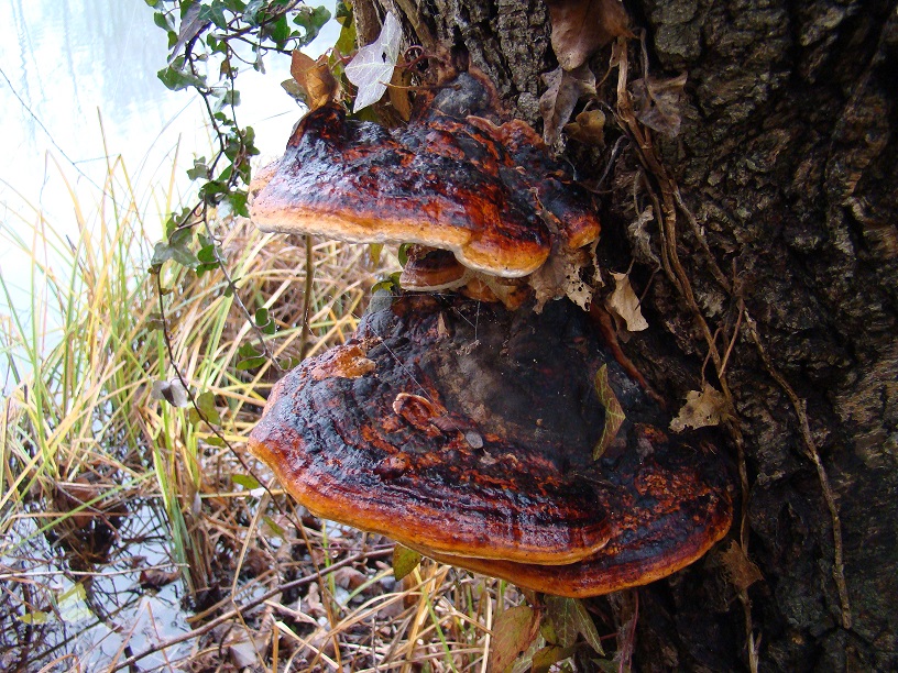 5. Ganoderma resinaceum - Harziger Lackporling - wir werden hier immer unsicherer. Der Baum ist wohl auch Pappel, teilweise noch lebend, auf dem Stubben sind sie nur zum Fotografieren abgelegt, der hat sonst nichts damit zu tun. Die FK sind übrigens relativ klein, so 3 - 5 cm. Das erste Bild etwas überblitzt, zeigt aber gut die Wuchsform.