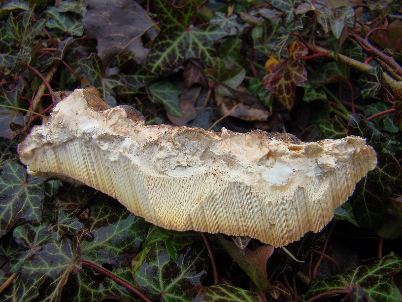 Aber wie schon gesagt: irgendwie bringe ich die teilweise herablaufenden grau, grau-schwarzen bis doch ein bisschen gelblich wirkenden Poren nicht mit dem Aussehen der Hutoberseite (glänzend, dunkel, schmale Hüte) und dann noch mit dem Substrat in Einklang...