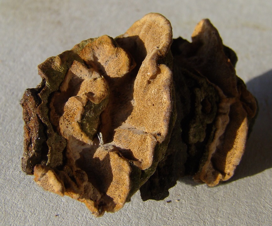 Wenn morgen wieder Tageslicht ist, versuche ich mal noch ein paar Fotos von den jetzt völlig trockenen Ex. zu machen, auch vom Anschnitt. Trama sieht dunkelbraun aus, Hutoberseite wulstig, jetzt trocken überhaupt nicht mehr glänzend und fast schwarz dunkel graubraun. Röhren bis zu 3-schichtig, auch braun. Geruch jetzt keiner mehr vorhanden, ob frisch, kann ich leider nicht mehr sagen. FK im Ganzen jetzt völlig holzig hart.