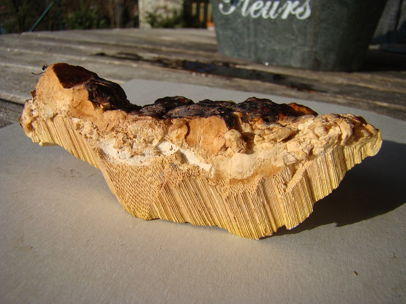 Unabhängig davon hier noch ein Bild nachgereicht zu Trametes (=Coriolopsis) trogii - interessant finde ich hier insbesondere dass sich das striegelige Aussehen bis in das Fleisch reinzieht.