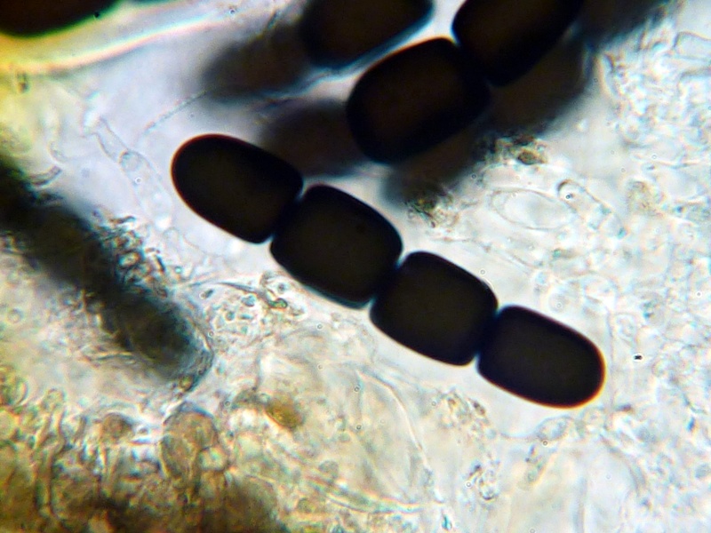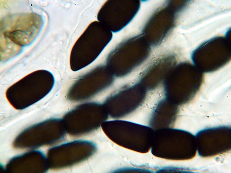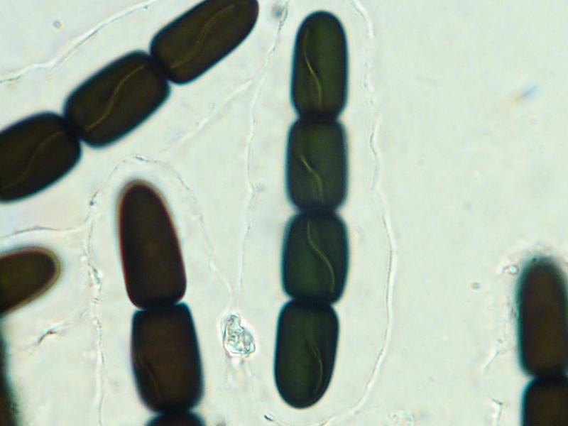 Die Sporengröße geht weit über die von S.teretispora hinaus (bereits auseinanderdriftende Sporen wurden nicht vermessen). Allerdings gibt es auch kleinere, die grenzwertig nahe dran sind. Je größer, reifer?, die Sporen sind, um so spitzer sind die Endzellen. Spitze Endzelen sprechen wiederum für S.megalospora. Dafür sind sie aber etwas zu schlank. Die stark geknickte Keimspalte passt wieder eher zu S.teretispora, wobei ich S. megalospora nicht aus eigener Anschauung kenne.